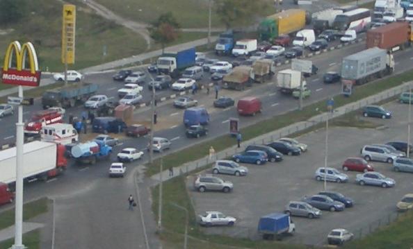 Подъехали пожарные, скорая, куча гайцев и два пустых самосвала. Чуток впереди стоит фура - похоже оппонент. Намечается полная Ж... Объезжайте...