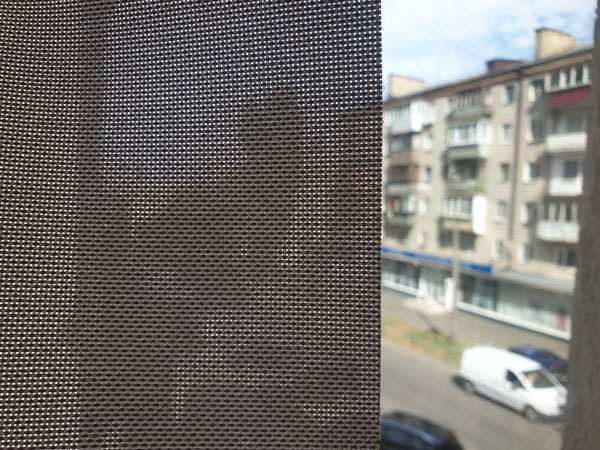 Есть ткань для тканевых ролет или рафштор, она тоже идет сеткой. Через нее видно, но также и затенение есть. Даю реальную фотку как оно выглядит на просвет. Цвета есть разные, вплоть до черного