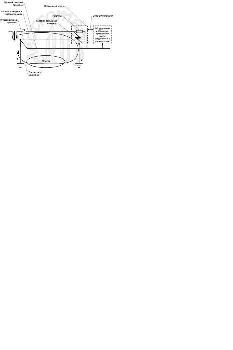 "...На практике встречается также ошибочное заземление отдельного электроприемника или группы электроприемников на обособленный заземлитель, не связанный с нейтралью трансформатора. Эта схема заземления напоминает схему ТТ, с той лишь разницей, что при этом нарушается п. 1.7.39 ПКЭ..(про зануление). Это требование вызвано тем, что обеспечить электробезопасность при такой схеме невозможно. Показан вынос потенциала при коротком замыкании на корпус электроприемника, заземленного на обособленный (незануленный) заземлитель. Потенциал на корпусе будет обусловлен падением напряжения в фазном проводнике до точки КЗ и падением напряжения в сопротивлении заземлителя 2, в среде (в земле и конструкциях) и в сопротивлении заземлителя 1. Сопротивление цепи короткого замыкания при этом будет больше сопротивления цепи «фаза-ноль», исходя из параметров которого выбирается защитный автомат, и короткое замыкание, скорее всего, не будет отключено действием максимальной токовой защиты. При этом на корпус будет вынесен потенциал, близкий к фазному напряжению, что создаст угрозу для жизни людей."