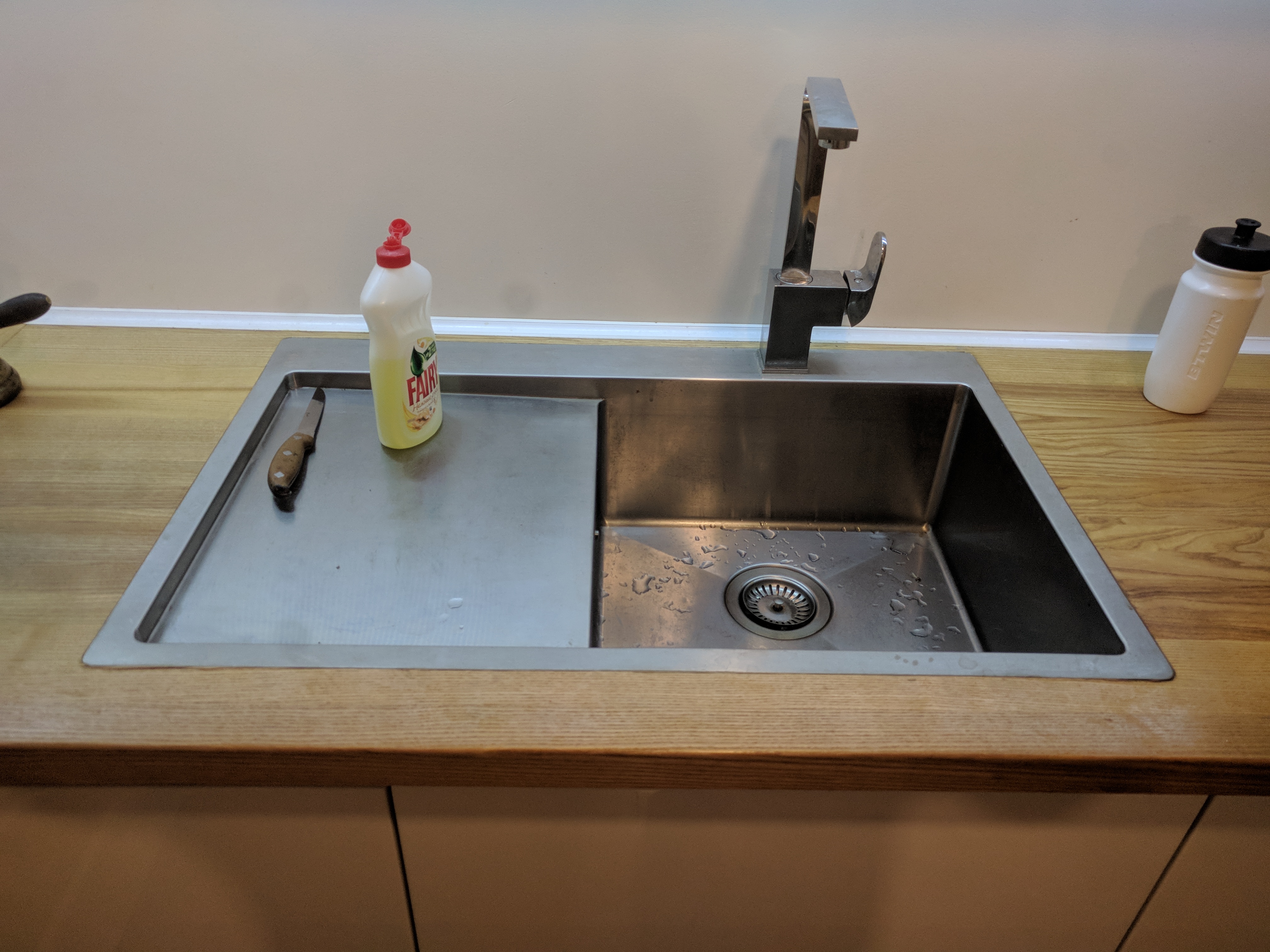 врезная мойка должна быть заподлицо с поверхностью - в этом углу немного выступает. Поздно заметил. У меня долгая и неприятная история с фирмой, которая делала кухню. Косяки, пропущенные сроки, некомпетентность, забытые шкафчики и как финиш - когда я через год ставил посудомоечную машину - обнаружил, что они перепутали местами дверцы от посудомойки и соседнего шкафчика, переставлял сам в итоге.