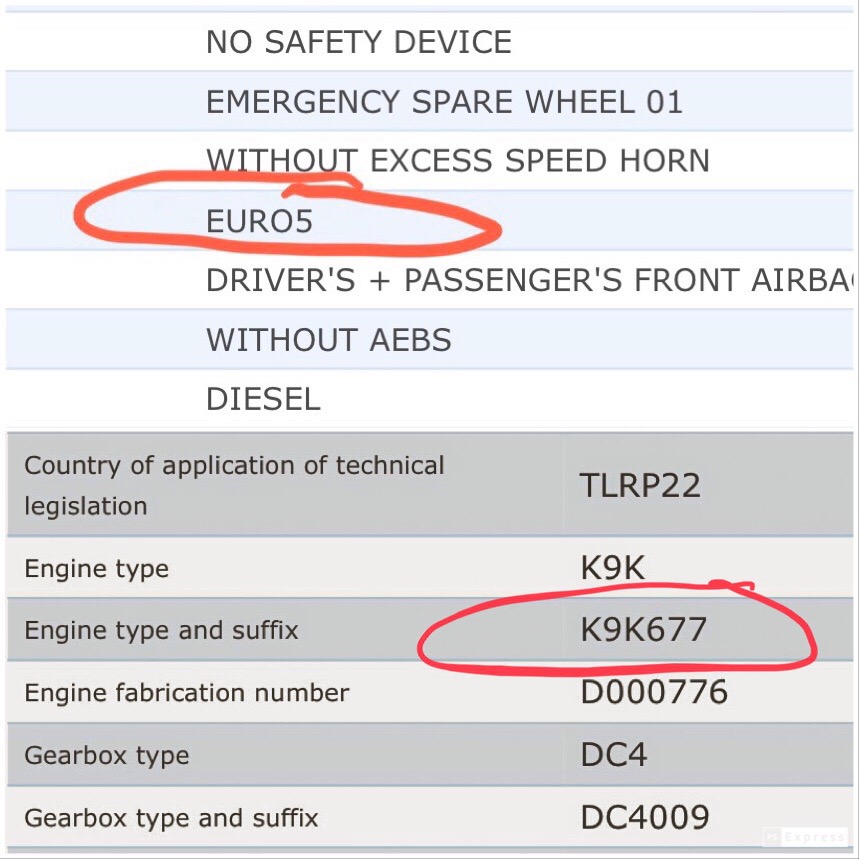 K9K имеет кучу версий - разные турбины, топливные, экология и т.д, Соотв разная мощность при одинаковом объеме. Каждое исполнение имеет свой заводской код. Написано на блоке двигателя, но проще узнать по VIN.