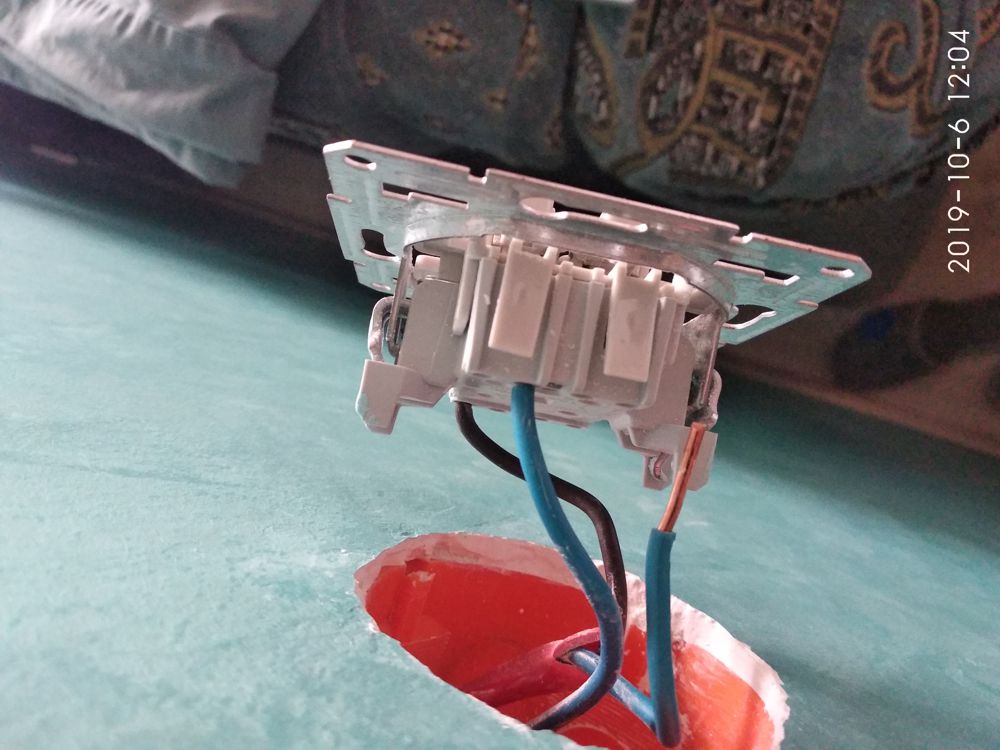 Вот фото. Черный провод - это фаза L, два синих - это на свитильники. Менял синие местами - ничего не менялось. Сначала по периметру доп лампы загораються и только потом центральная люстра. А я я хочу чтобы сначала люстра с кнопки и только после второй кнопки - доп свет.