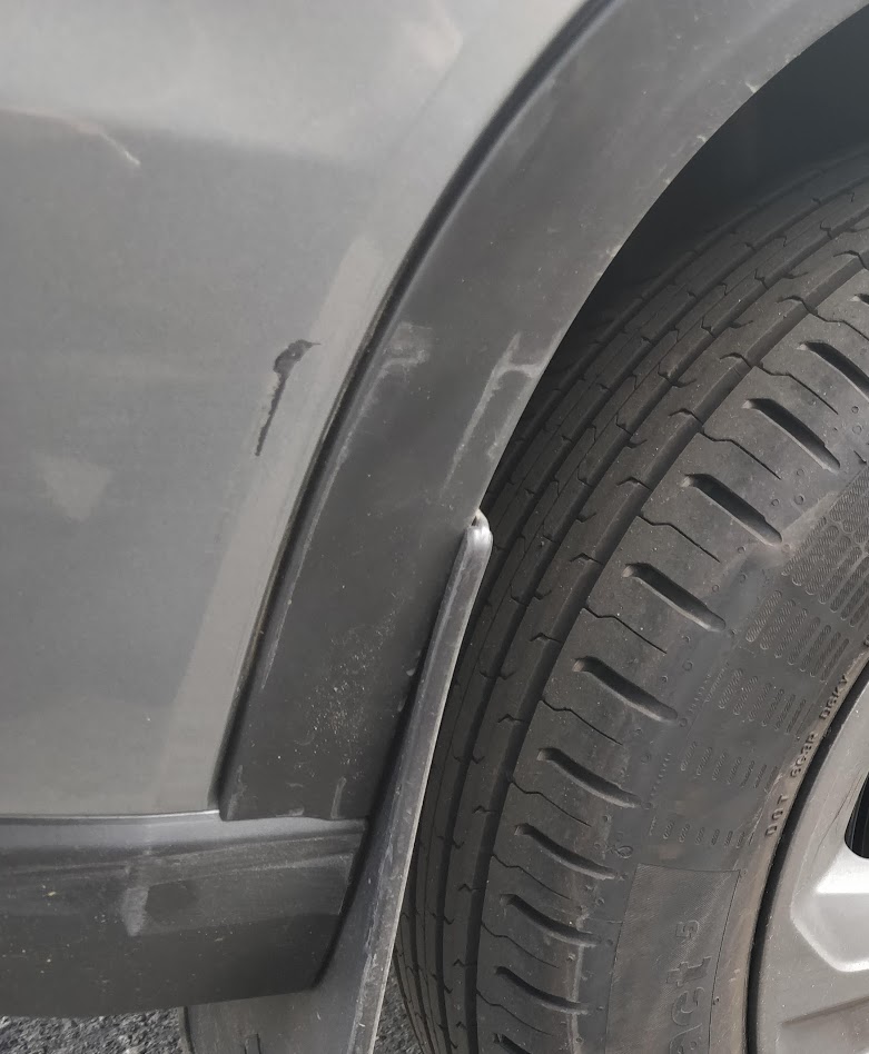 Протёрся на парковке задним бампером об столб с резиновой накладкой. В результате содрал немного краски: черная царапина пару сантиметров в длину, 0.5 см в ширину и пластиковая накладка на колесе немного протёрта.