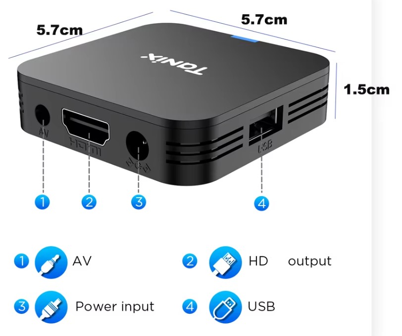 Tanix TX1 Процессор - 4 ядра Allwinner H313 Видеокарта - Mali G31 MP2 Память 2/16 Gb Wifi 2.4G Операционная система - Android TV 10 питается от usb телевизора (шнурок в комплекте, блока питания нет, подойдет любой 5 ватт от телефона, если хотите подключить в розетку)