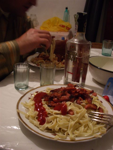 Как оказалось, впопыхах из продуктов мы привезли только водку и 300 гр. колбасы. Макароны и полпакетика кетчупа были найдены случайно завалившимися за дверцу буфета.