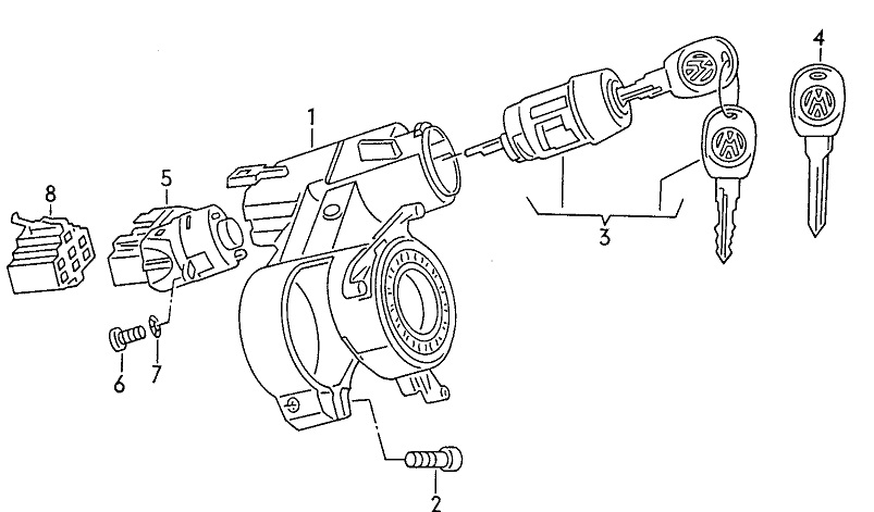 Наверно, деталька 3 стала плохо крутить детальку 5. Там пластмассовые внутренности в детали 5 изнашивается иногда. Можно сначала просто пошатать, подтянуть вверх, может она неплотно сидит. Или сразу снять и заодно заменить (это забавный квест по поиску и выкручиванию винтика 6). Деталька 5 называется контактная группа замка зажигания 6N0905865 (это проверить). Стоит 100 или 600 например гривен.
