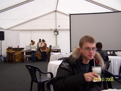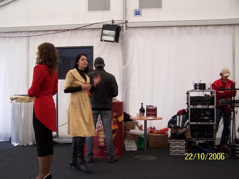 В палатке: экран, наливайка виски, ди-джей и администратор(ша)