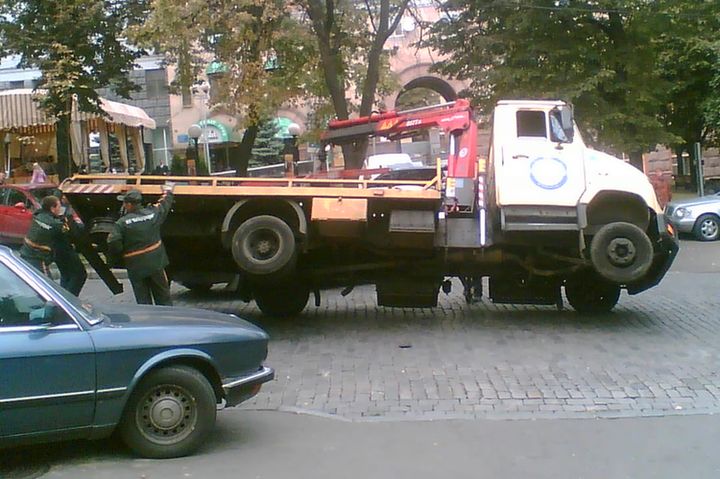 город Киев, центр, улица Прорезная возле казино "Сплит", сегодня 16:00. На моих глазах ушлые и вездесущие эвакуаторщики поднимают зеленую 5ку БМВ. Не зафиксировав должным образом свой эвакуатор (торопятся бабло собрать), не удержав машину, роняют ее с 1.5 метровой высоты на проезжую часть (булыжная мостовая). Эвакуатор стоновится на 2 колеса и зависает над машинкой. Прохожие и водитель в шоке. Немая сцена.