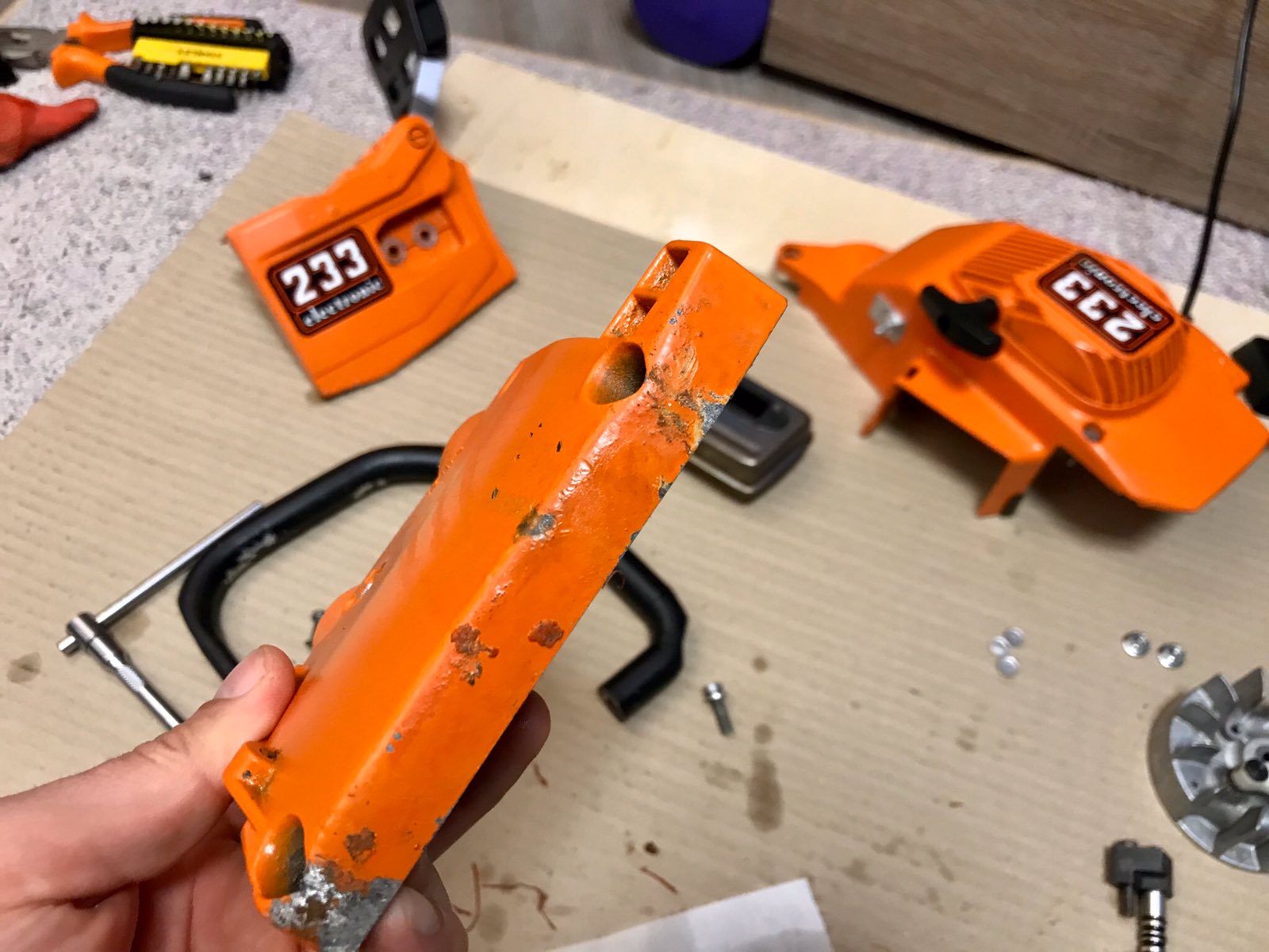 Коротко о проблеме. Взял на ремонт древнюю итальянскую бензопилу, в процессе ремонта выяснилось, что как инструмент она уже сильно отстает по режущим способностям даже от китайской какашки. Но бензопила интересная и в процессе ремонта родилась мысль ее реставрировать. Я потратил на реставрацию нереально много сил и время, затея оказалась невероятно трудозатратной (я 1000 раз пожалел что согласился на это). Но после того как я довел бензопилу до идеального состояния (видео прилагаю) и отдал заказчику, он мне ее принес всю подёртую, со словами "плохо заводится". Кароче, на данный момент пила моя, но мне нужно перекрашивать с ноля, и так чтоб окраска не боялась масла/бензина и не отпадала при малейшем механическом касании... Посоветуйте, пожалуйста, способ покраски и саму краску. Заранее благодарен.