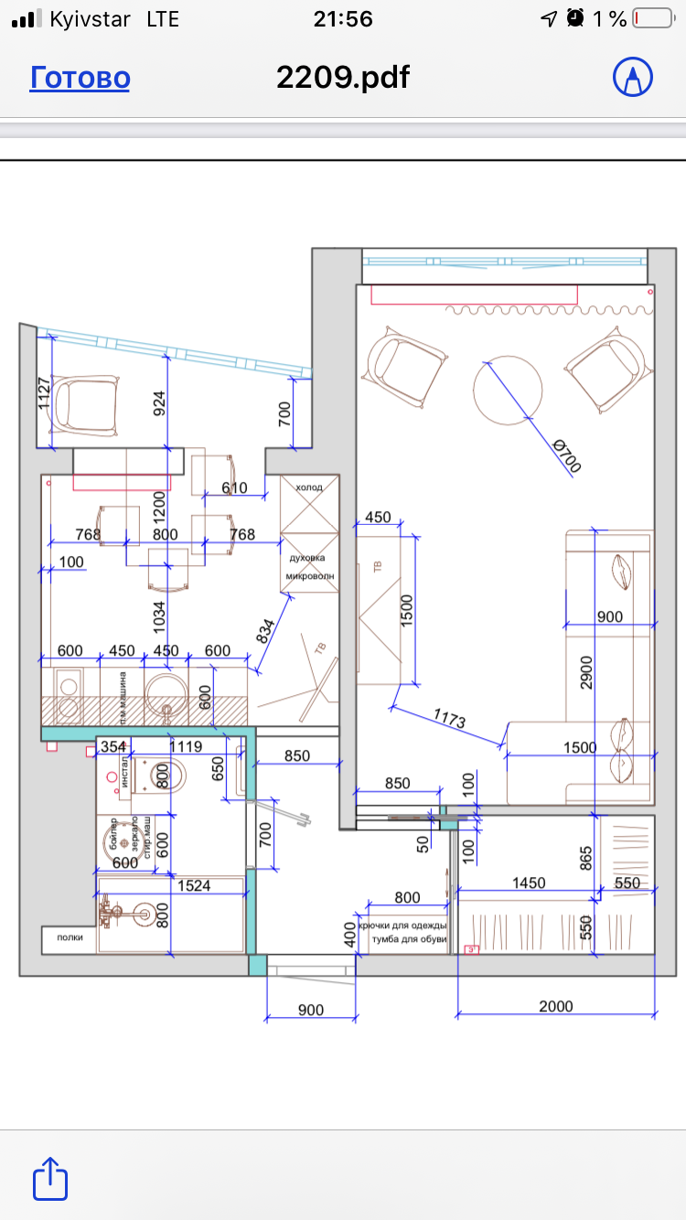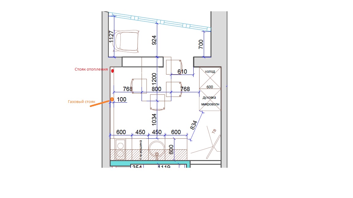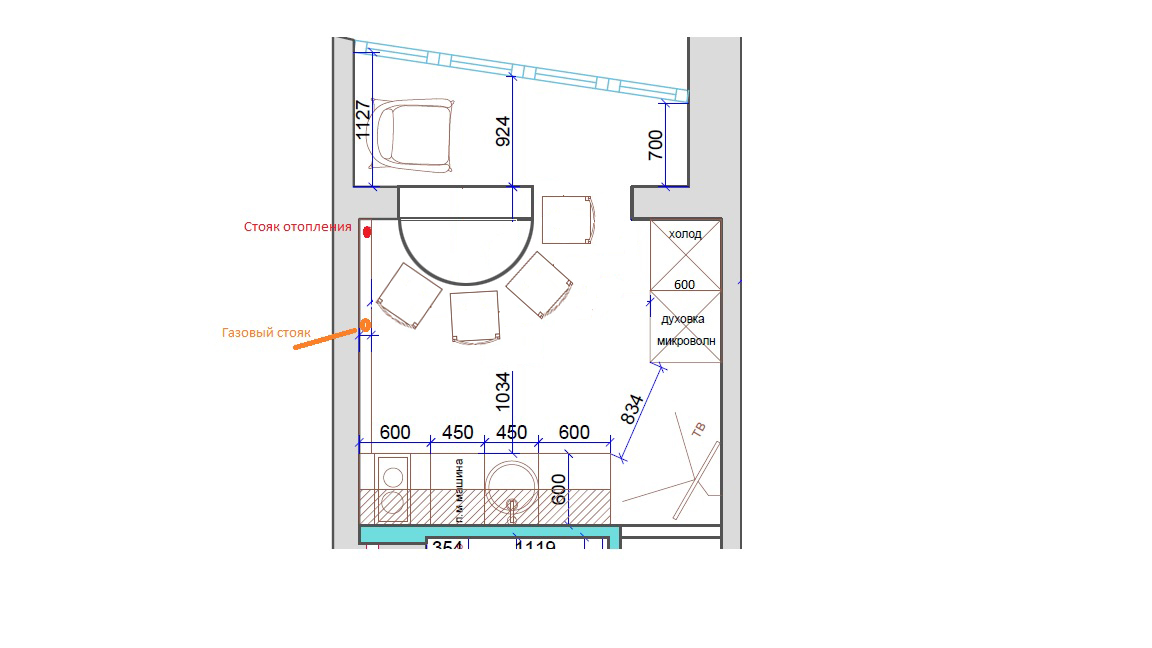 А какие общие габариты кухни? Я бы не перекрывала шкафами вид от входа в кухню, очень громоздко на такой площади холодильник + колонна. Духовку бы ставила в нижнем ряду, 2в1 с микроволновкой или от микроволновки отказалась бы вообще. Кухню бы ставила вдоль той стены, где стояки (нельзя ли, кстати, отказаться от газа и обрезать трубу? может хватит мощности для электрической варочной). Если стол предполагается на 2 человека, то ставила бы небольшой круглый столик d=800 и 2 стула на лоджии. Непонятно, кстати, там в один уровень пол или на лоджии выше? Если в один, то стульев можно больше втулить, и при желании стол выдвигать на середину. А в кухне бы поставила небольшой диванчик типа Блест грант, компактнее раскладного просто не знаю. Подоконный блок не восстанавливала бы, только сформировала нишу для того, чтобы адекватно стал кухонный гарнитур. А радиатор поставила бы высокий узкий вдоль откоса, и теплый пол на лоджии. Телек бы над дверью не вешала, эстетически не нравится. http://prntscr.com/ryhfvr