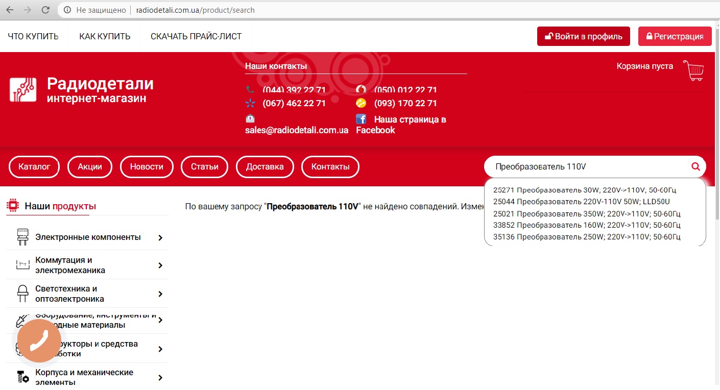Да-да, точно буквальный. По запросу "110v" нужных устройств не находит, а по "Преобразователь 110v" - "не найдено", хотя в списке(до нажатия enter) они мелькают. И думай потом это ты слово не угадал или товара такого нет