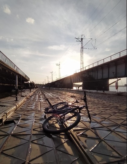 Установили понтонный мост, но из-за того что упал уровень воды пропускают только на велосипедах и мопедах.