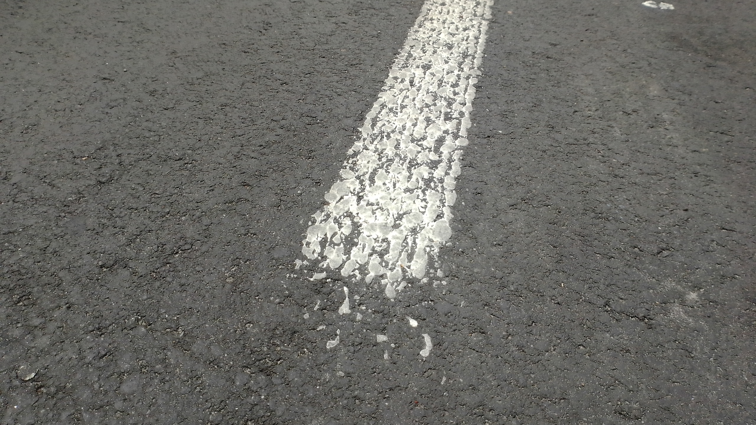 Не знаю чим її малюють, але це, мабуть, накращий матеріал розмітки що був у нашій країні. Виглядає трохи неакуратно, проте, вона НЕ слизька і має бути довговічною.