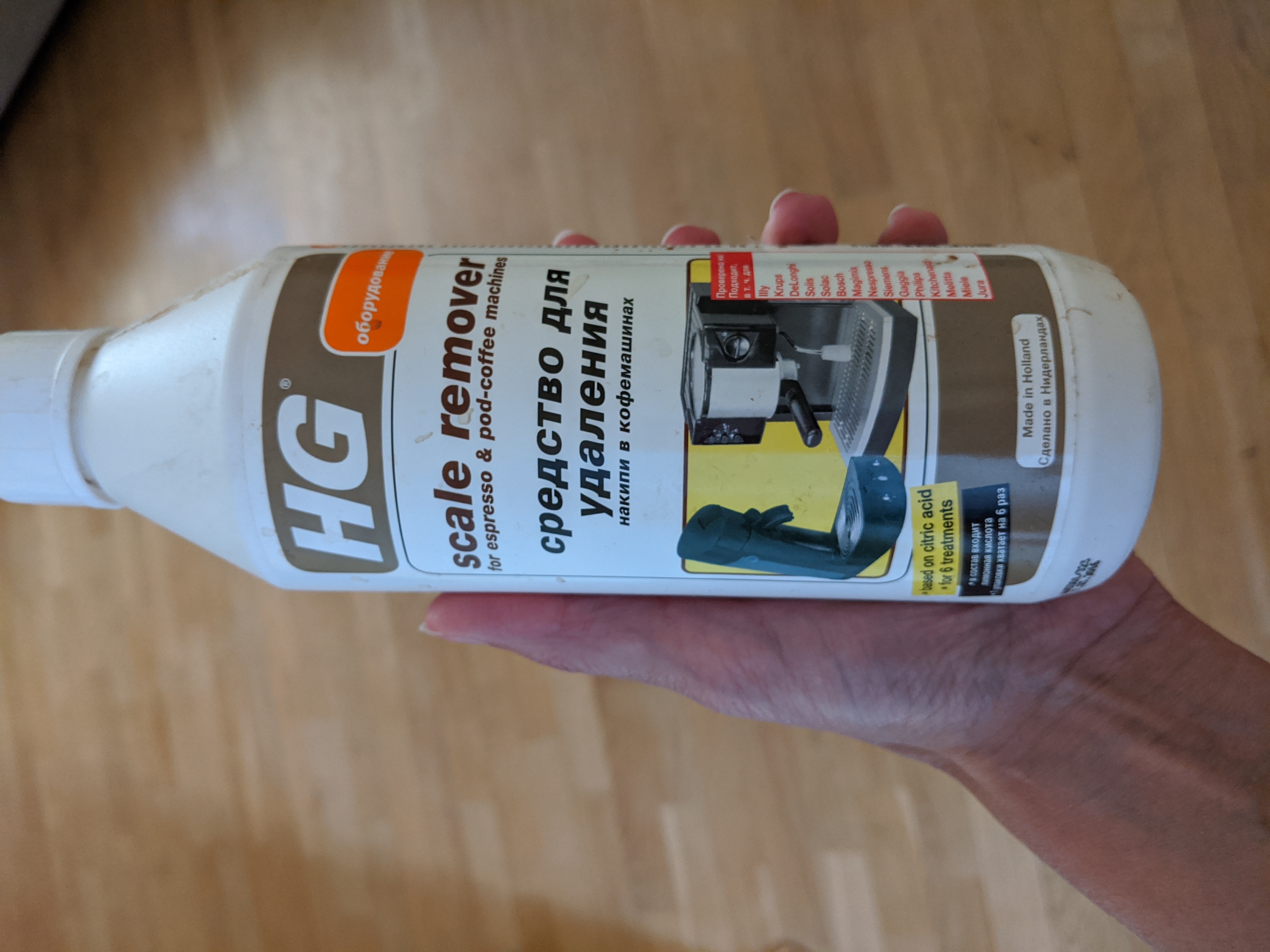 Я покупала специальное средство для удаления накипи в кофемашинах. В Эпицентре. Что-то около 150 грн за бутылку. На несколько раз.