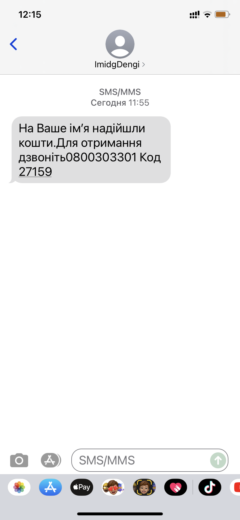 Пару днів тому СМС отримав: На Ваше ім’я оформлено переказ коштів Тел: 0800300285 Код 25069