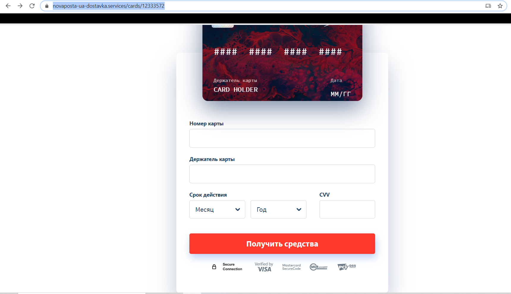 Сегодня была попытка развода Продаю кое что на OLX - написали в Вайбер (номер не сохранился) что хотят купить товар и предложили оформить сделку через Новую Почту, скинули ссылку на страницу где для получения денег нужно заполнить все данные своей кредитки - https://novaposta-ua-dostavka.services/cards/12333572 Будьте осторожны!