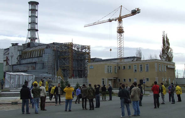 Небольшой бросок вдоль обводного канала АЭС, строящегося совместно с французами хранилища отработанного ядерного топлива, недостроенного 5-го и 6-го ее блоков (всего их должны были построить 12 - Чернобыльскую станцию планировалось сделать самой мощной в Союзе) и вот мы объезжаем здание администрации станции, напрвляясь к 4 блоку. Нас предупреждают, что 1, 2 и 3-й блоки, подходы к которым щедро опутаны колючкой, фотографировать запрещено. А вот на площадке метрах в 200 от объекта «Укрытие», с обратной стороны станции фотографируй сколько хочешь. Здесь мы «зависаем» на полчаса, пока все сфотографируют все, что хотят. За это время подъезхал «Порш Кайен» с киевскими номерами (я, правда, так и не уследил – это туристы или кто-то связанный со станцией – в салоне были два мужчины и женщина) и микроавтобус с такими же «туристами» как и мы. Проходя мимо нас, было слышно, как ождин из приехавших, пожилой дедуля, рассказывал, что он работал здесь в 1986-м на строительстве «Укрытия» и за это время западная его стена отклонилась уже на целых полметра – сейчас этому противостоят специальные конструкции, издалека похожие на строительные леса…