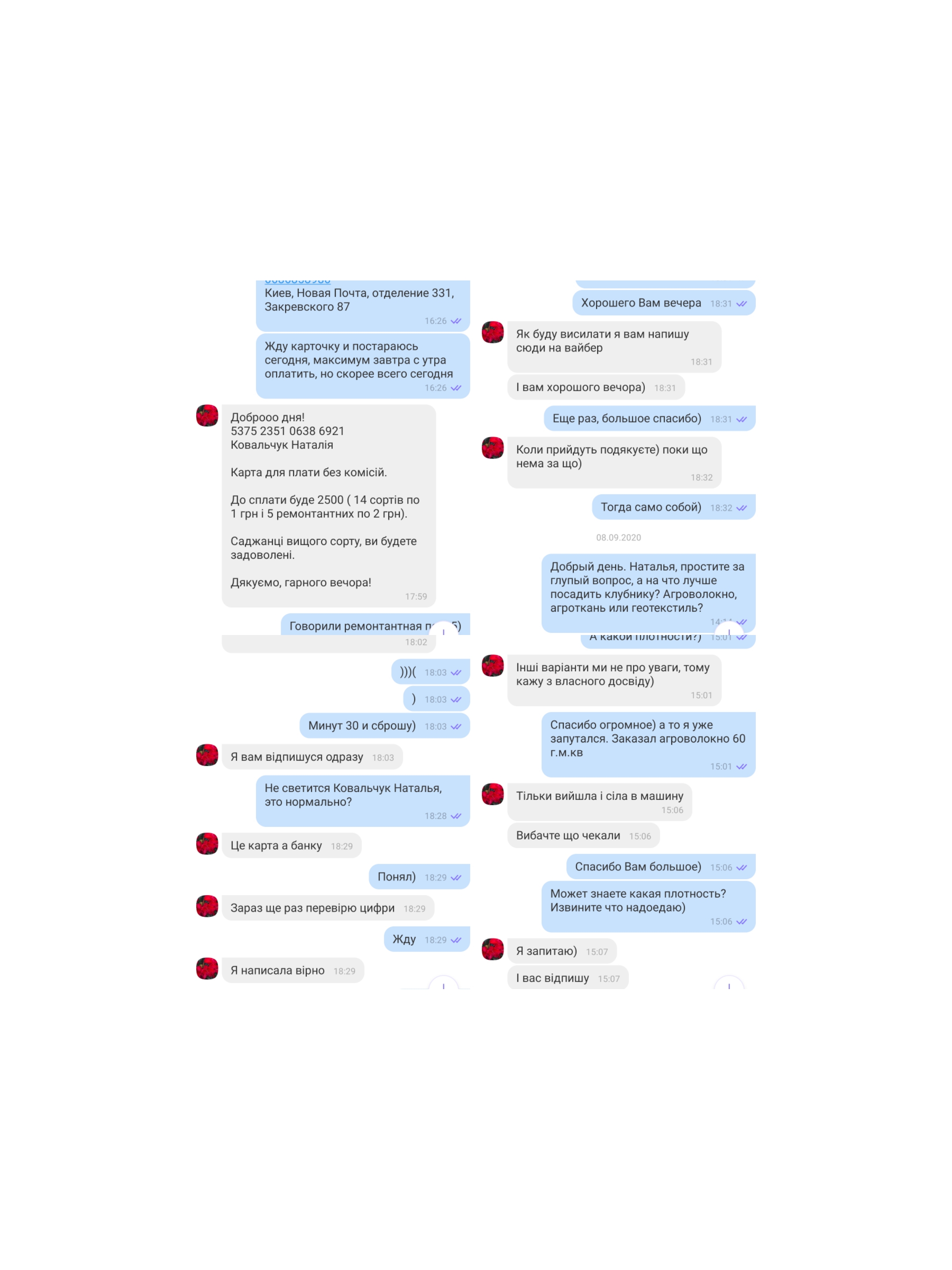 Далее переписка, сторговались на 15 сортах по 101 штуке по стоимосте 1 грн за штуку, и 5 сортов по 101 штуке по 2 грн за штуку. Сделал оплату на карту, отправил всю сумму. Знаю сам дурак, но привык доверять людям да и в объявлении было указано, что есть наложенный платеж. Суть да дело, в положеный день не отправила, были рассказы что у них работают зеки,иалкаши и тд и тп. С горем пополам отправила. Дальше выясняется, что мне отправили наложкой и я еще должен доплатить 350 грн, и опять рассказы про директора и тд и тп. Приехало, откровенно говоря, мусор!!! Который стоял в воде дней 5!!! Корни на фото и то что приехало, вообще не соответствует. И приехало не все 202 куста (2 сорта), вообще не приехало!!! Дальше я предупредил, что их действия расцениваюттся как мошенничество, она слезно пообещала отправить завтра, потом после завтра, теперь вообще мороз. Обьяву удалила, теперь продает какое то другое растения.