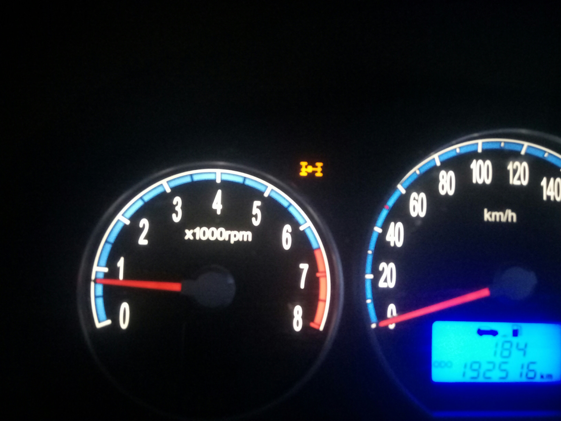 Ось такий світився (фотка з інету). Не мигав, а саме включився і не тухнув до швидкості вище 40 км/год. Перший раз я банально як раз парканувся і заглушив двигун. Після запуску двигуна - все було ок, індикатор, як завжди, на пару сек. включився і потух. А коли повторив ту ж процедуру з діагоналкою - спеціально розігнався до 45-50 - індикатор погас. Все. Більше не вмикався, тільки штатно - при запуску двигуна.