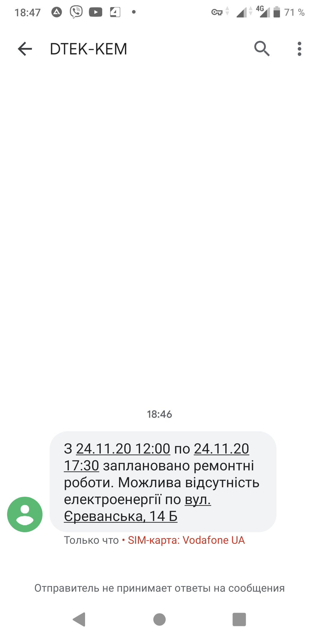 Тупо вырубили, в 11:00 без всяких предупреждений Звоню диспетчеру с аварийной заявкой, в ответ: та це планові роботи на танформаторній підстанції, сьогодні до 19:00, проводить дтек... твою ж дивизию!!!