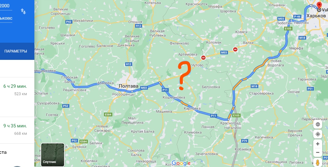 Якщо вірити тому ж гуглу, змінивши масштаб: вище Чутового виконується ремонт мосту, паралельно йому зроблено тимчасовий (понтанний?) переїзд. В Сніжкові (перед Валками) - напевне, теж є об'їзд закритого місця через заправку (?).