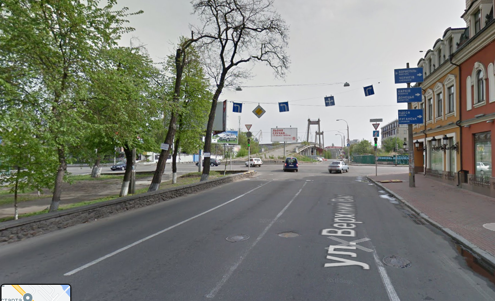Причому тут "прямо"? Ще раз. Це Подол. Малюнок вище показує дорогу, яка називається Верхній Вал. Перпендикулярна їй дорога називається Набережно-Хрещатицька. Дорога зліва, за бульваром - Нижній Вал. Я їду по Верхньому Валу, повертаю наліво на Набережно-Хрещатицьку і мені потрібно далі їхати по Набережно-Хрещатицькій. АЛЕ. Після повороту наліво на Набережно-Хрещатицьку, в третю полосу, мені можна їхати тільки наліво, на Нижній Вал. Так зрозуміло написав?