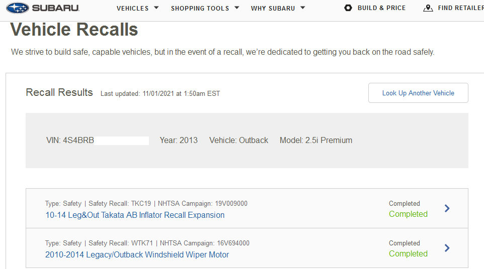 а у меня таки на "американском" выдает : VIN: JF2SJARC5HHХХХХХ Год: 2017 Автомобиль: Forester Модель: 2.5i Limited Тип: Безопасность |Отзыв о безопасности: WUM98 |Кампания NHTSA: 19V701000 Передняя подушка безопасности пассажира Forester ODS Тип: Удовлетворенность клиентов |Кампания по обслуживанию: WRB21 |Кампания NHTSA: н / д 17-18 Конденсатор Forester