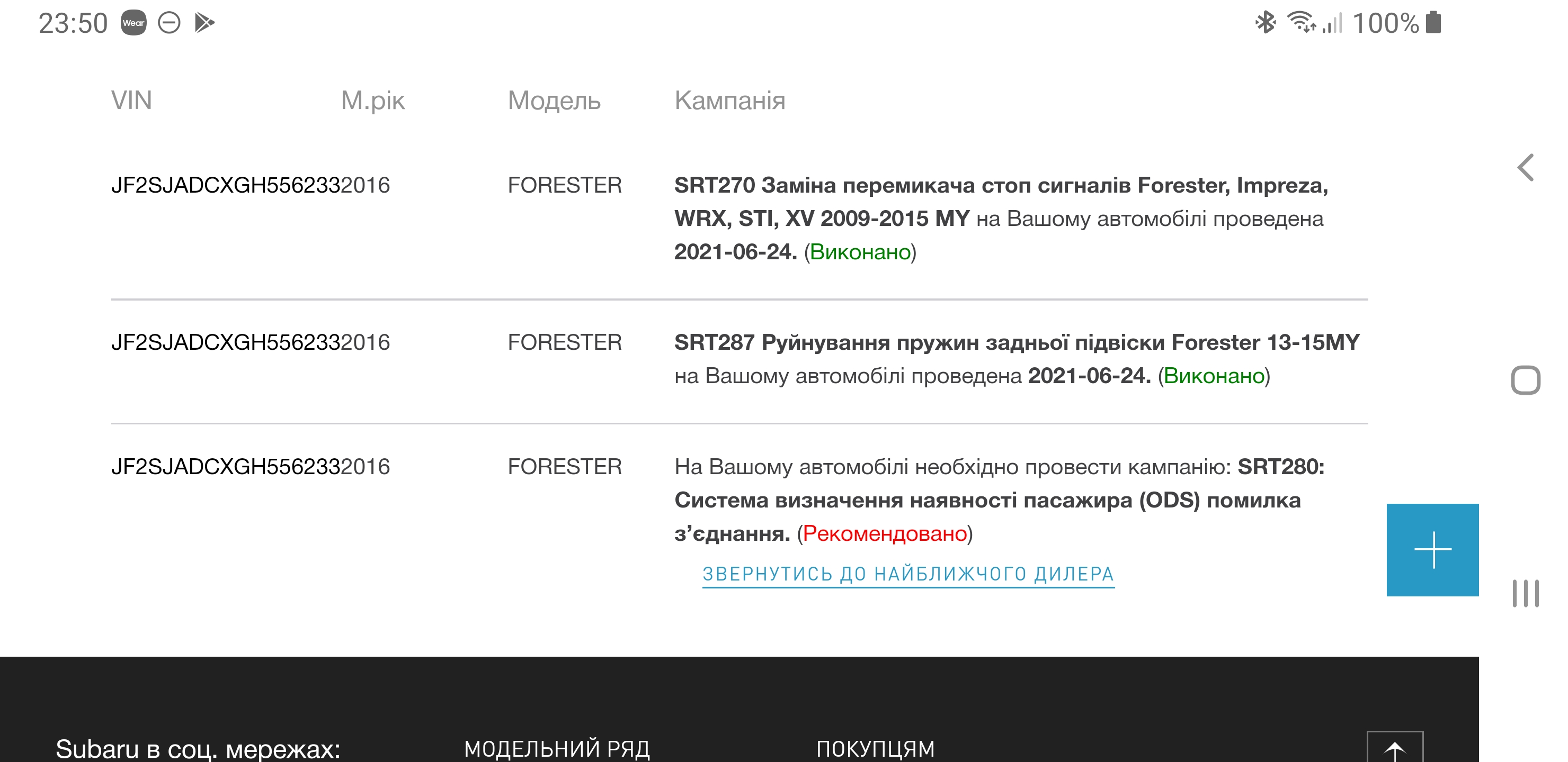 Поделюсь опытом, может кому пригодится. Итак имеем форик 2016 года Америка. На сайте https://www.subaru.com/vehicle-recalls.html по винкоду смотрим свои сервисные компании. У меня там было их три. Едем к официалам в Киеве (я на Интрциклон поехал). Обращаемся к менеджеру, он без вопросов пробивает по своей базе вин и добавляет вас в базу субару-Украина (это сутки занимает ))) ). И на следующий день ваш вин начинает пробиваться уже на нашем сайте https://subaru.ua/vin-checker далее едем и бесплатно меняем то что положено :-) Исключение составляют только те компании, которые работают только для штатов, т.е. в Европейских комплектакциях таких запчастей нет. В итоге мне сделали 2 из 3. Заменили задние пружины и переключатель стоп сигнала. На общую неоплачиваемую сумму примерно 3300 грн. Приятный бонус.