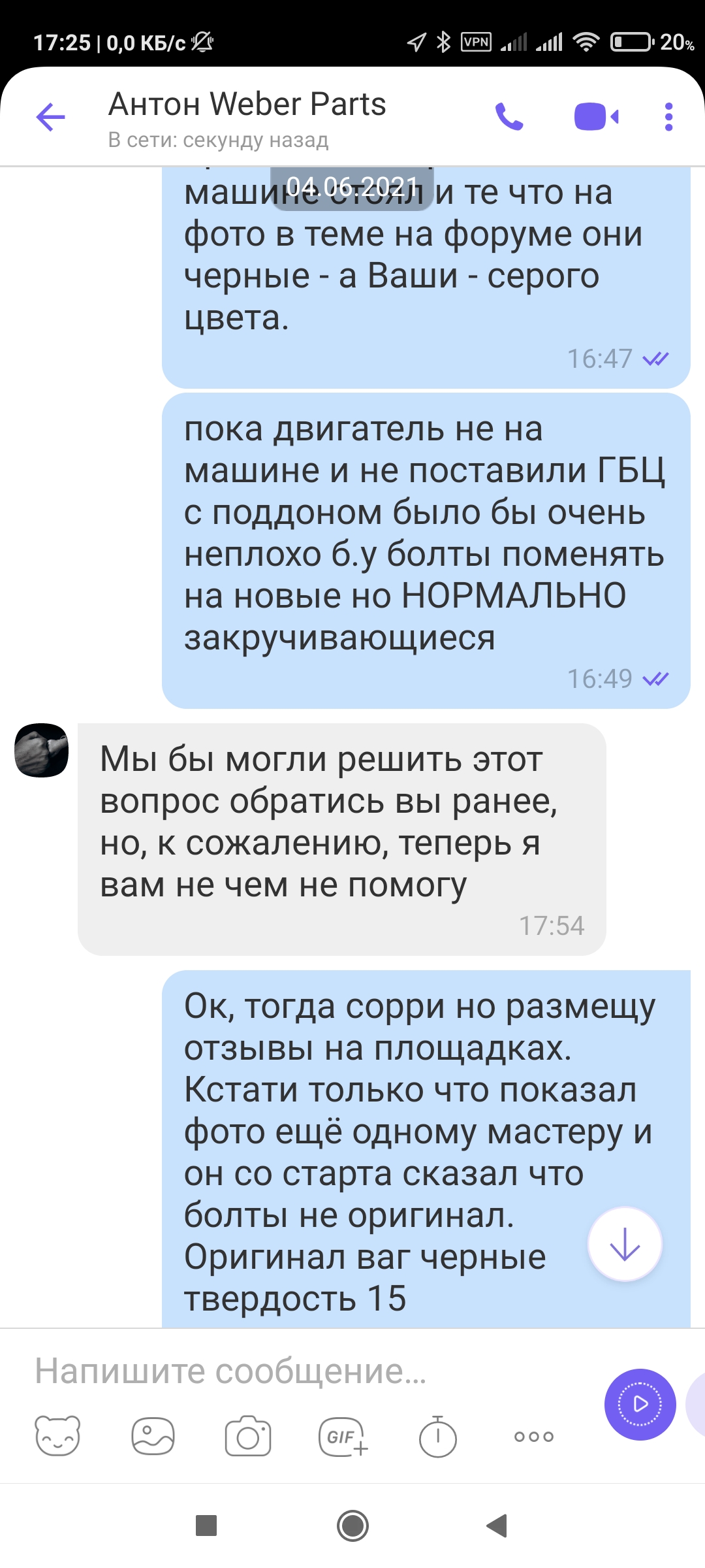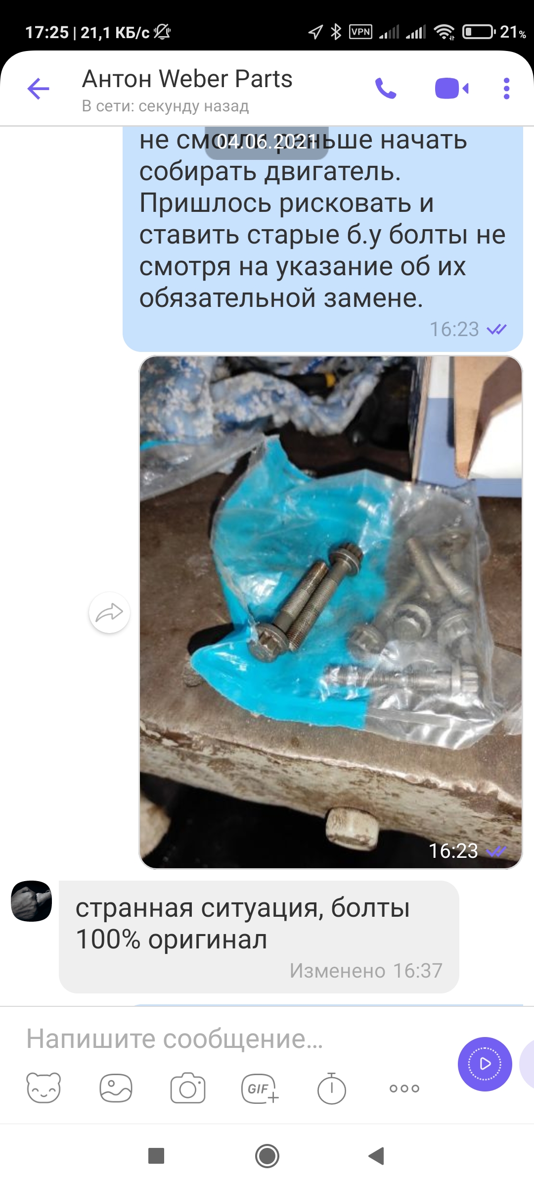 В одной части меня убеждают что не может быть и болты 100% оригинал, а во второй, после фото присланных и оригинала, что мол поздно, 14 дней прошло, потому гуляй .