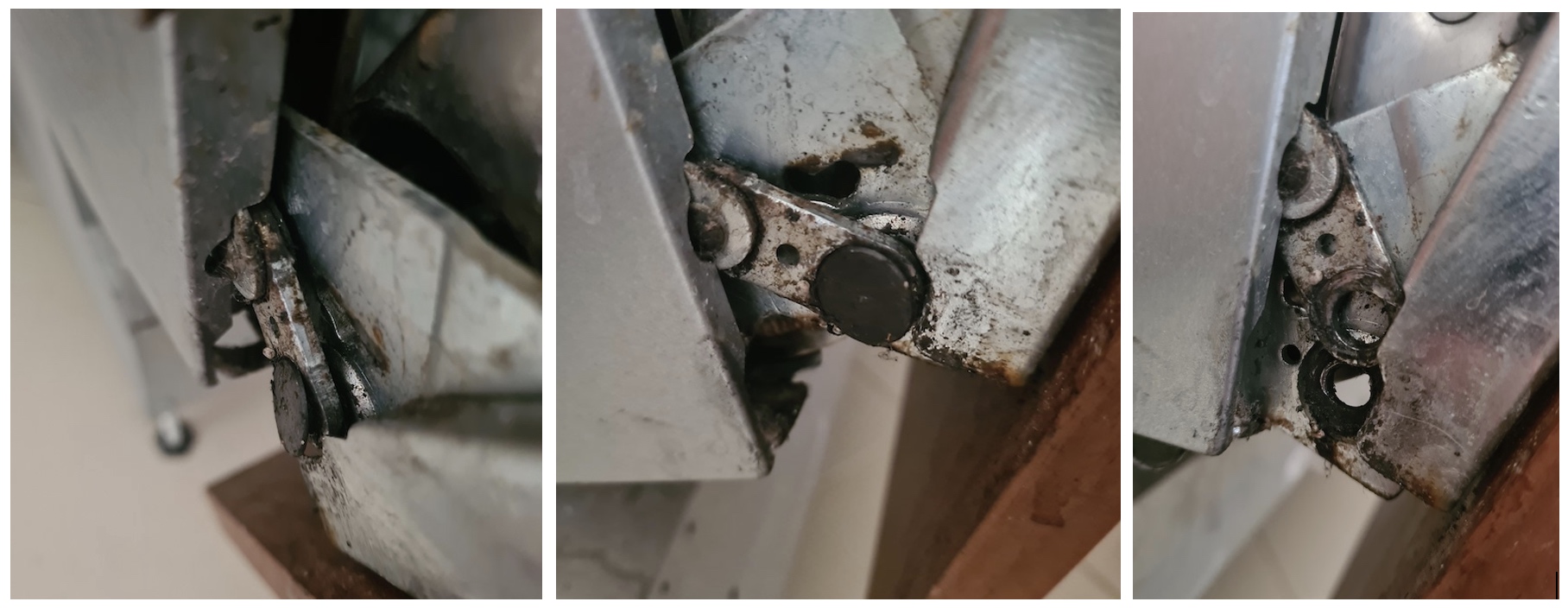 Вылетела черня фигнюля типа "заклепка", соединяющая петли (см.фото). В итоге дверца открывается с трудом и провисает. По форме заклепки и дырок не понятно - или там что-то отломилось, или (скорее всего) со временем разошлись отверстия и они уже просто ее не держат.