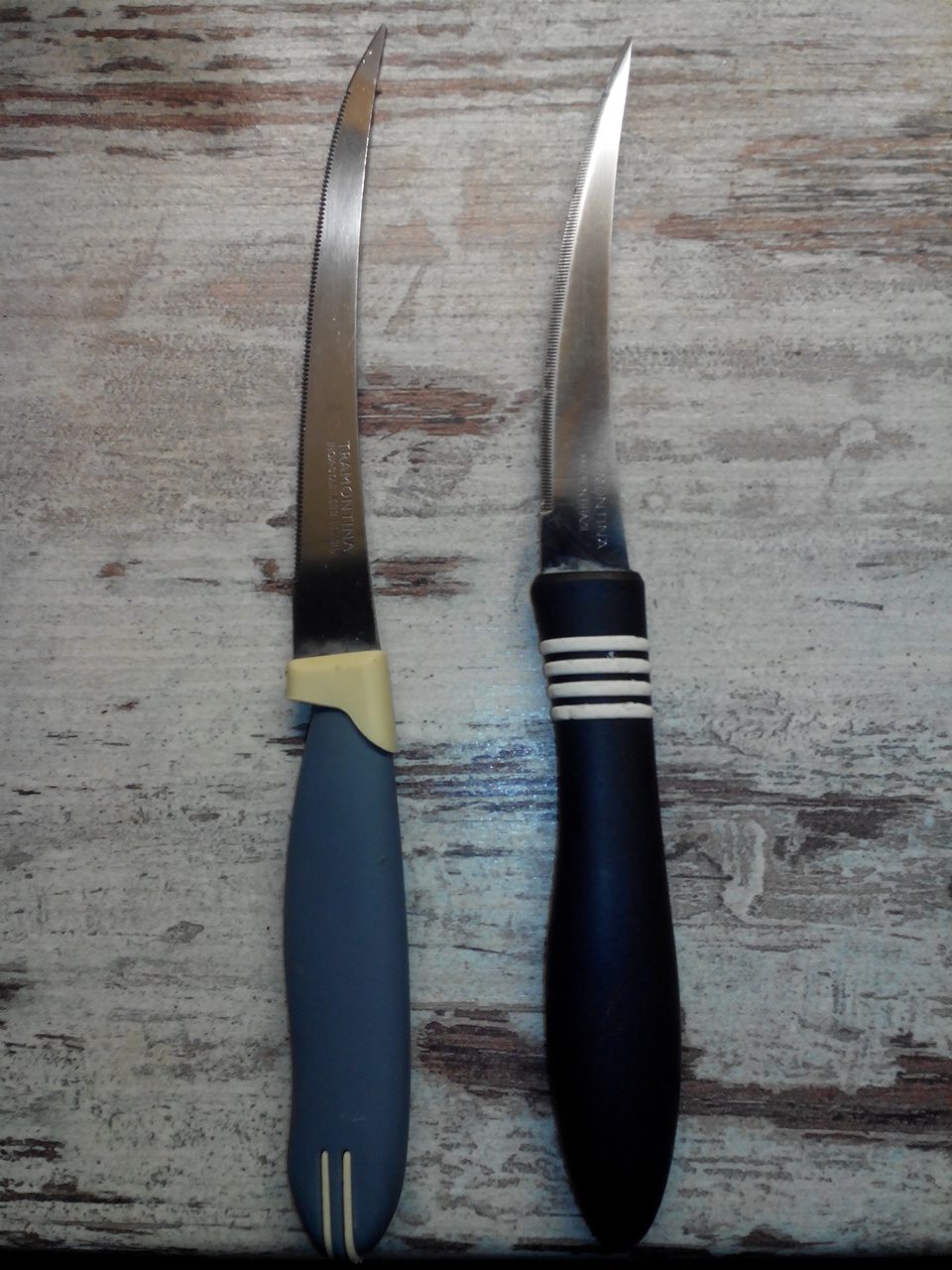 Справа качественный, живет лет семь. Купил за 9грн. в посудном магазине на кассе. Написано мейд ин Бразилия. Эксплуатируется нещадно. Слева китайское нечто. Пачка из 12 штук стоила около 110грн. Тонкие лезвия гнутся, отламываются и ржавеют. Такими ножами забиты инетмагазины и Ашан. Хочу купить такой как справа и не вижу. Может кому попадалось на глаза?