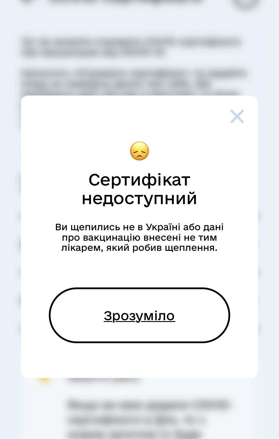 Интересно, как у тебя в приложение получилось подтянуть сертификат? У меня телефон точно также сообщает, что сертификат недоступен, потому как вакцинировался не в Украине.