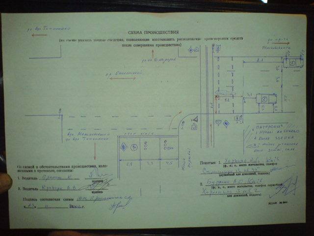 Время действия - примерно 22:30. Синяя машина (наш форумчанин) выезжает с парковки у Патэрсона, закупившись продуктами на неделю (тот еще вопрос - я там бы не закупался ). Выезжая он тормозит у знака Главная дорога, понимая что выезжает все-таки с прилегающей территории. Дальше он смотрит в сторону Оболонского проспекта, где нет машин, а потом совершает главную ошибку - дает по газам чтоб выехать в третий ряд и пойти на разворот по кругу. В это время Ганзалис спешит с Малиновского на моргающую стрелку для поворота на Оболонский. Два одиночества встречаются за рельсами на пешеходном переходе. Cкорость у Гонзалиса несколько выше, он разворачивает синюю машину и проезжает дальше. Все. Гонзалисом оказался индус, плохо понимает по нашему. Я пришел на место встречи минут через 15-20 после аварии. Пообщался с индусом, потренировал свой английский Он сам мне признался, что ехал на мигающую зеленую стрелку. Это косвенно подтвердилось тем, что водитель синей машины видел как загорелся прямой сигнал для трамвая. Проверили - загорается когда уже потухла стрелка. Так же вводят в полное заблуждения знаки приоритетов. Чувствуя задницей что все же не прав синий, намекал ему разъехаться полюбовно. Кстати, индуса только уговорами удалось оставить на месте - порывался уехать. У индуса КАСКО, но нет ГО. У Синего есть ГО, но нет КАСКО