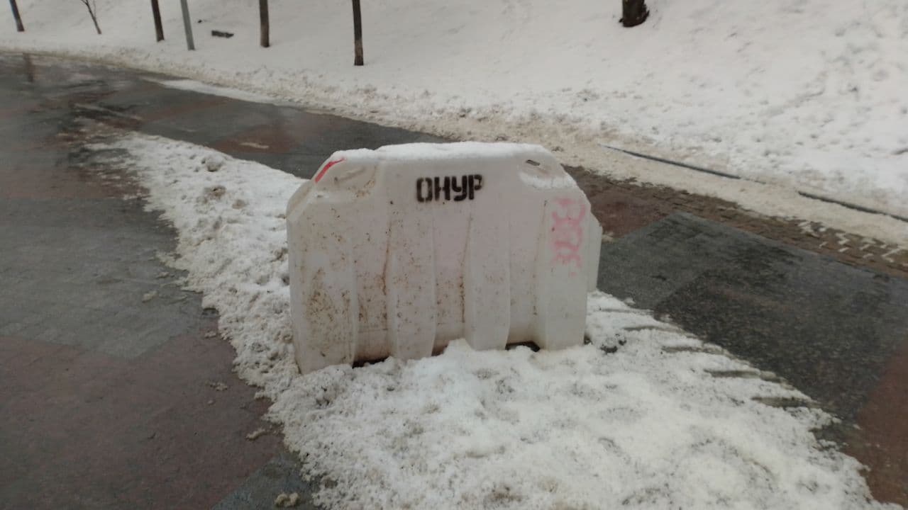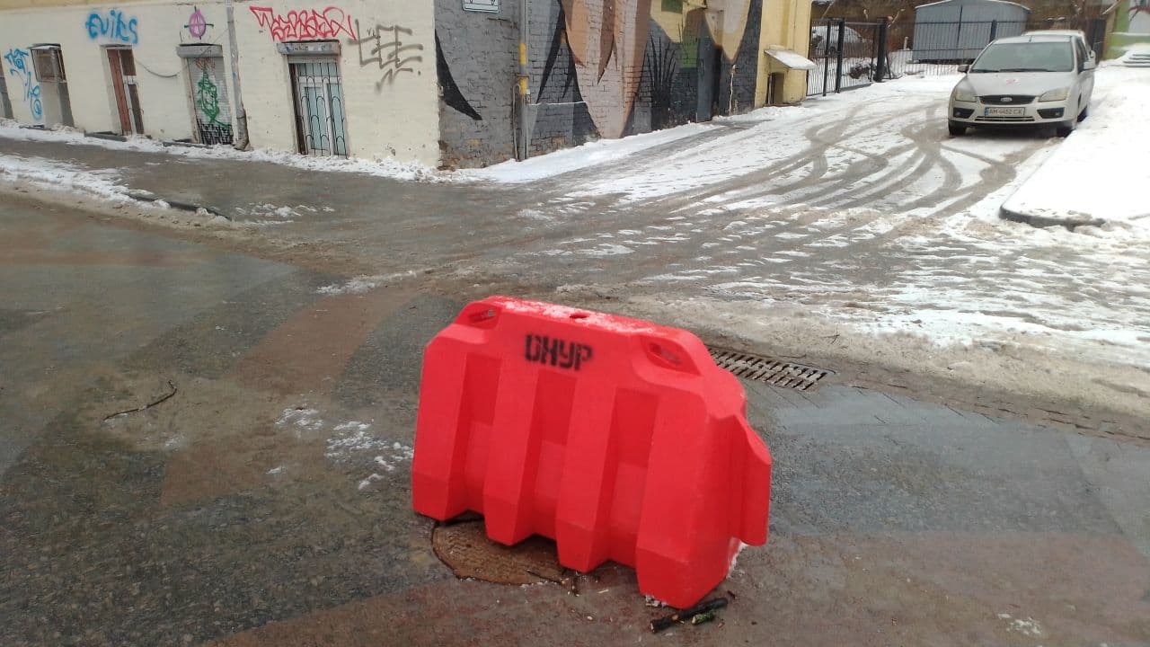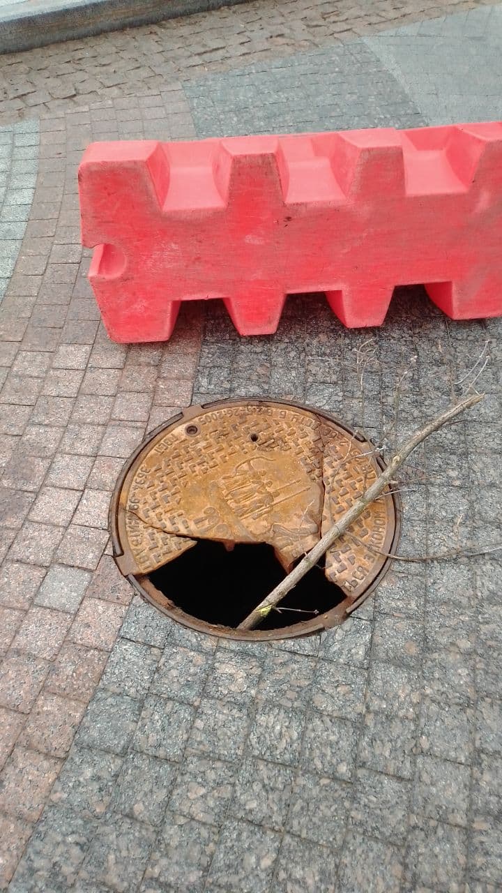 Значить люків як і боллардів теж два зламали. На люках позавчора стояли пластмасові бар'єри з написом "Онур" (такий як на фото валяється). На Десятинному я не приглядався, думав, що він там цілий.