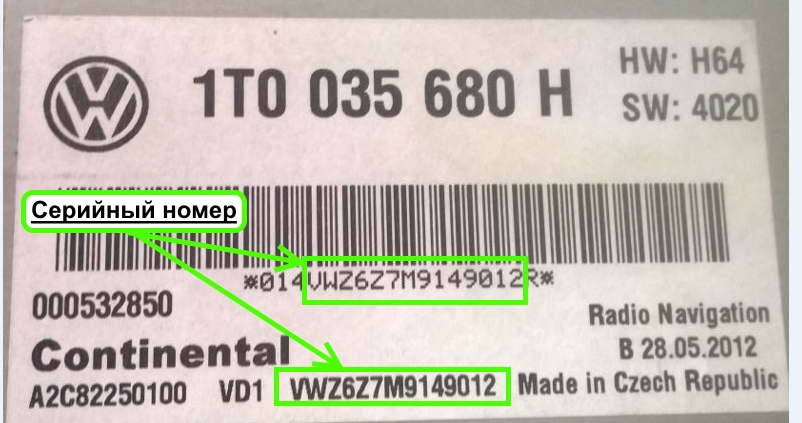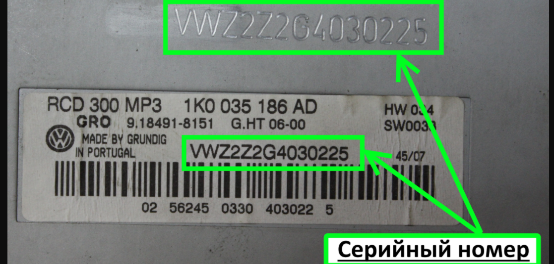 Привіт, маю можливість знайти код магнітоли группи VAG. Для отримання коду потрібно переписати з наклейки серійній номер AUZ...,VWZ...,SEZ...,SKZ..._ Або зробити фото наклейки на корпусі магнітол. Також серійній номер може бути в вигляді гравіровки по метали.