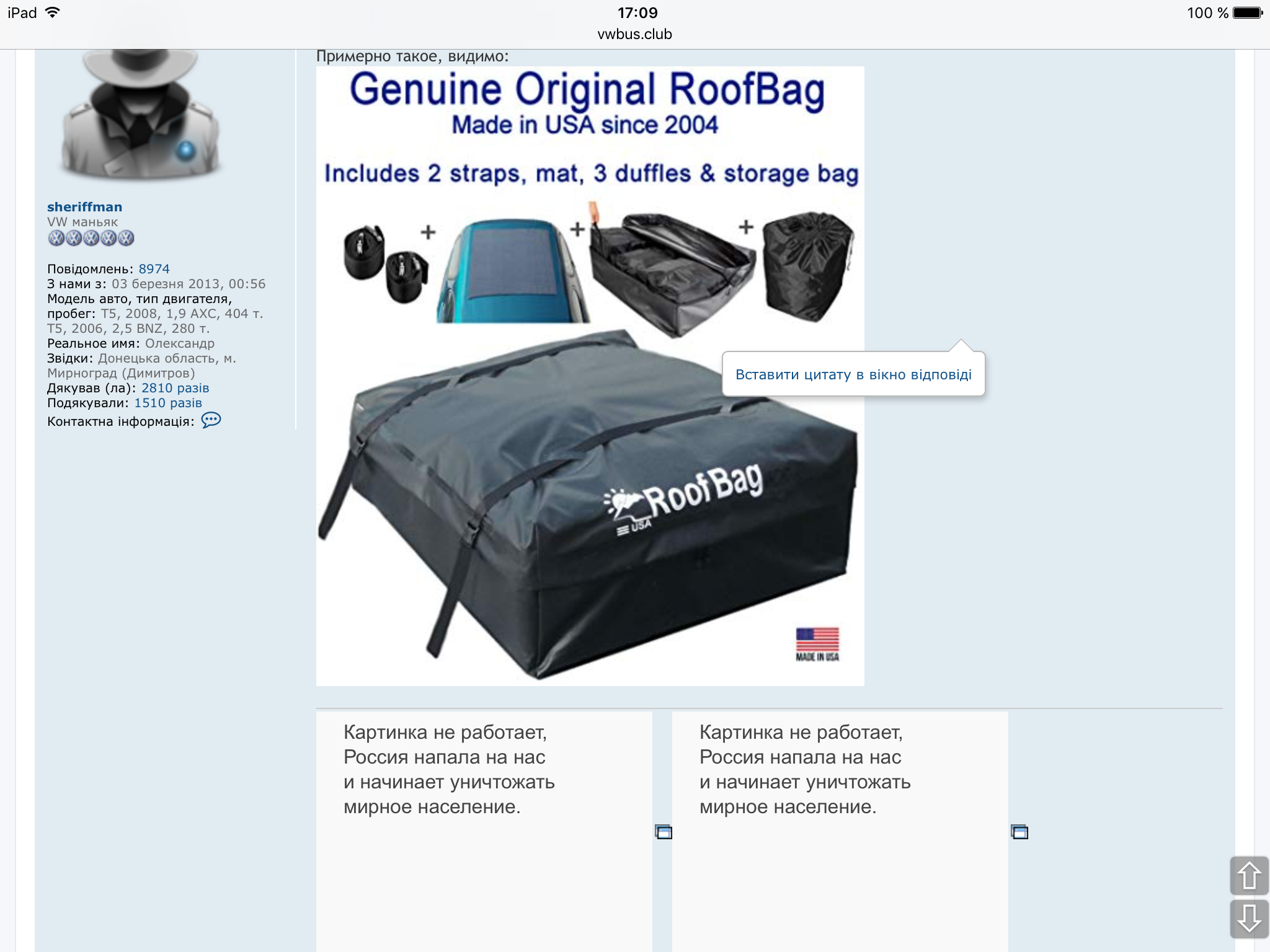 Вот нашёл тему с Буса клуба. Может понадобится Продам автомобильный багажник(СУМКА) на крышу автомобиля CAR ROOF BAG DETROIT. Приобретал за кордоном, до покупки автомобиля. После покупки буса проблема с багажником сама собой отпала? Хотелка 1000 грн. Если кого заинтересует,звоните,пишите тел.0973538680, фото прикрепить на форуме не получается. Могу сбросить Вайбер,Вацап,Телеграм.