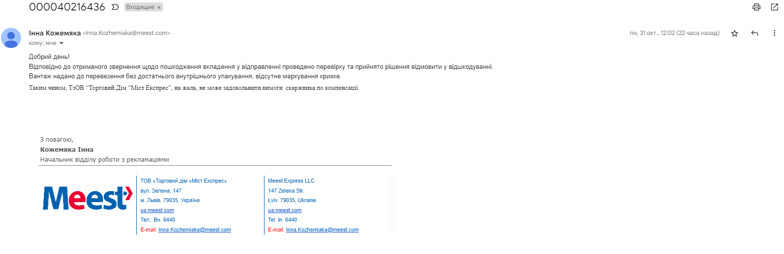 Таким чином, ТзОВ “Торговий Дім “Міст Експрес”, на жаль, не може задовольнити вимоги скаржника по компенсації.