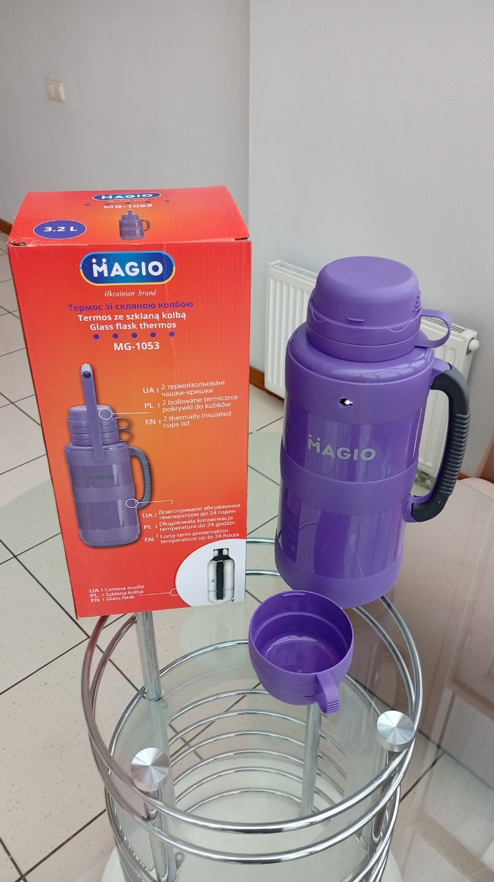 Великий термос об'ємом 3200 мл зі скляною вакуумною колбою. Зберігає тепло до 24 годин.