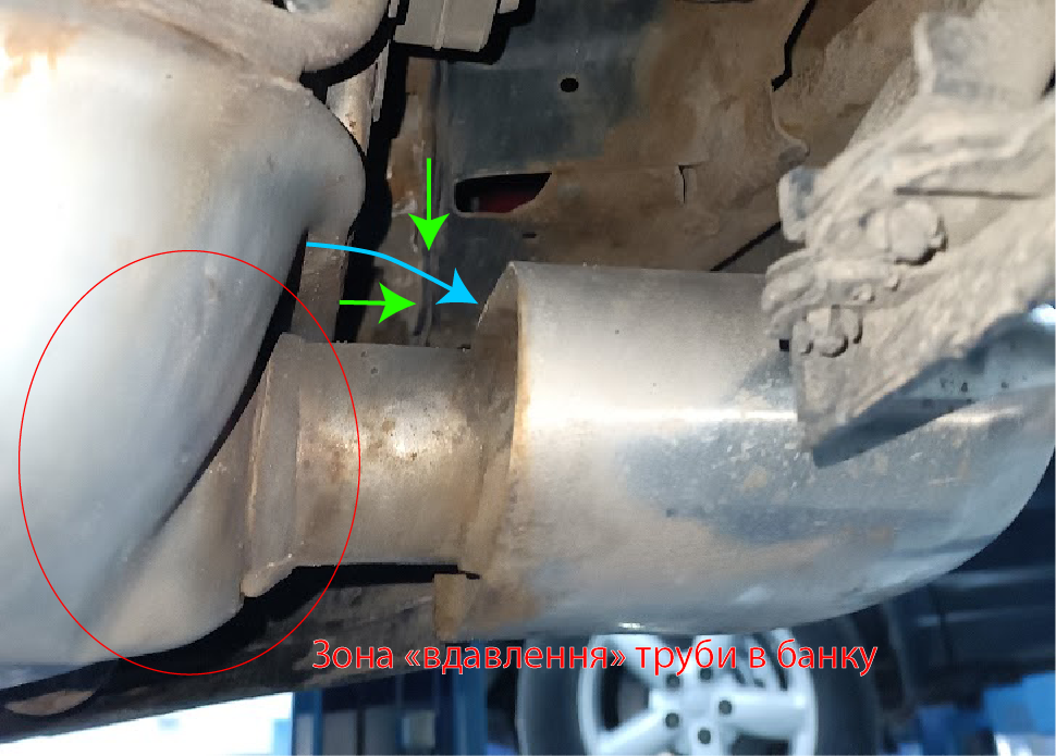 Короче. В пт., по дорозі додому, заїхав на перше потрапивше під руку СТО з підйомником. При детальному огляді було встановлено, що вдавило кінець вихлопу (трубу з декоративною накладкою) в банку, на банці є деформація "всередину". Спробували трохи витягнути, на мм 3-4 пішла, а потім почало зривати саму декоративну накладку вихлопу, тому що вона просто завальцована на кінці, а не приварена чи прикручена. Шкандали. Інтриги. Розслідування))