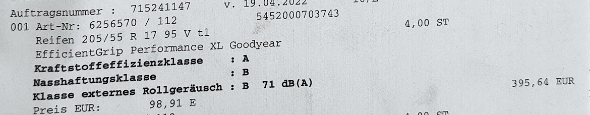 До того ж, я б не рекомендував GoodYear, були декілька разів мішка (праймасі 2, потім 3, і також ExtraLoad ), а оце перед минулим літом взяв цей GoodYear EfficientGrip Performance XL, бо пожмотився +20х4 = 80євро переплачувати за мішку, і різницю майже відразу відчув, в занос зриває набагато раніше, абс спрацьовує також раніше.. коротше кажучи, під ті ж самі маневри та стиль, що мішка спокійно виносила, гудеар пасе задніх. Не рекомендую його по цінам, близьким до мішки. P.S. ціна 98.91євро за 1шт - це без ПДВ, ще +19% доплатив за гуму, повна ціна за 4шт вийшла в 471євро