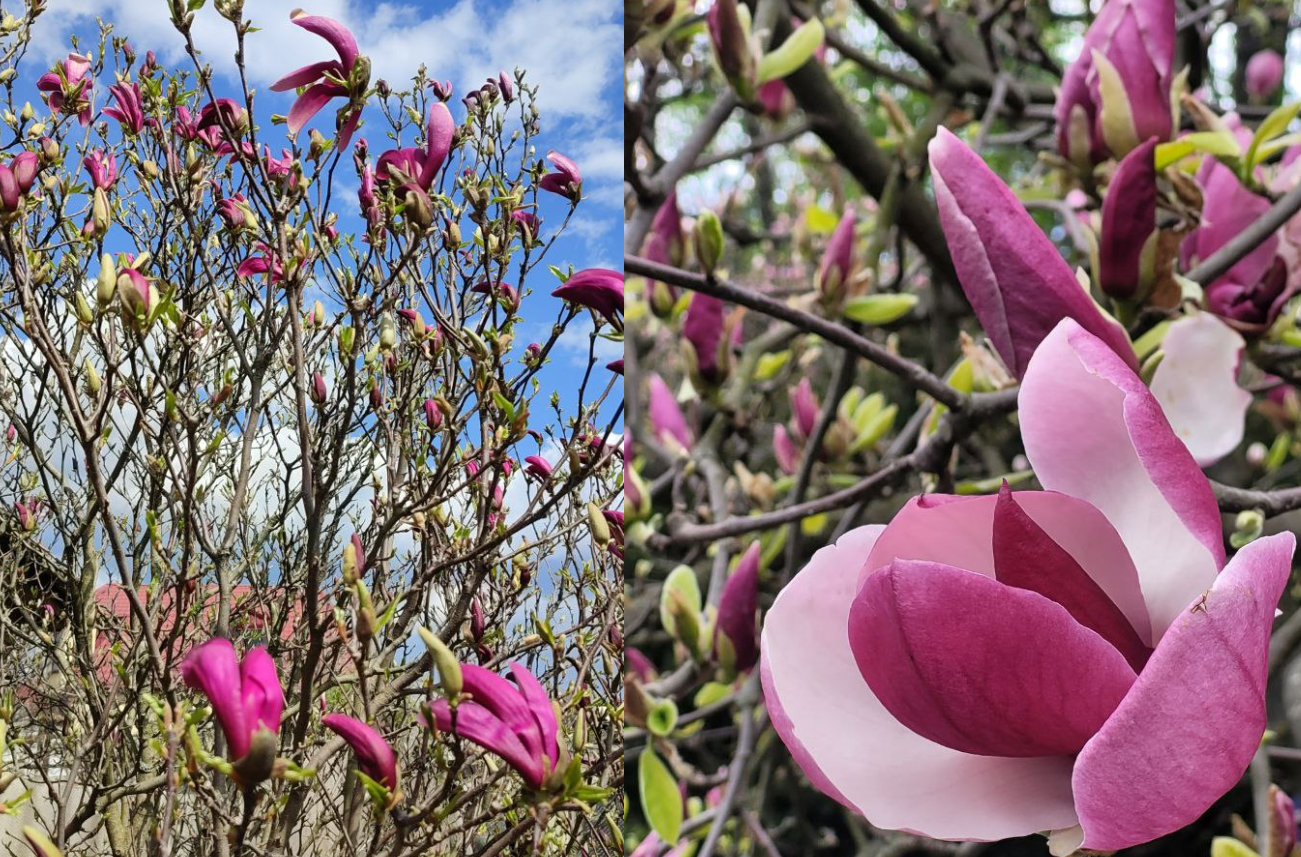 Дерево - розовая магнолия вроде. Она сильно теплолюбивее белой. Явно не киевский регион