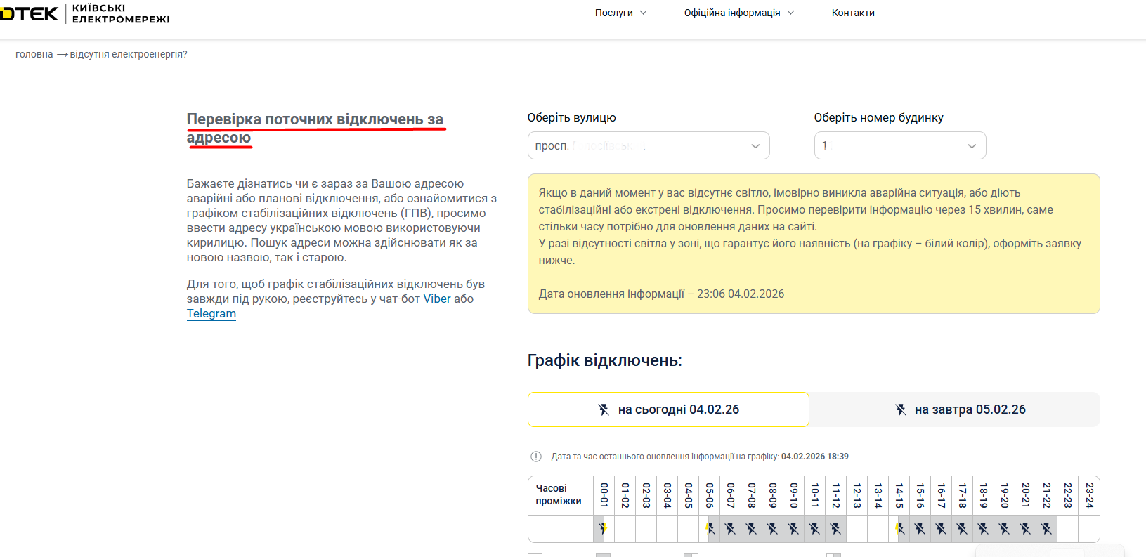 очень часто на этом сервисе возникает ситуация когда по адресу пишет что экстренные отключения и графики не действуют, а в телеграмм канале еСвітло по группам таки даются периоды отключения , включения. Надо только свою группу вычислить