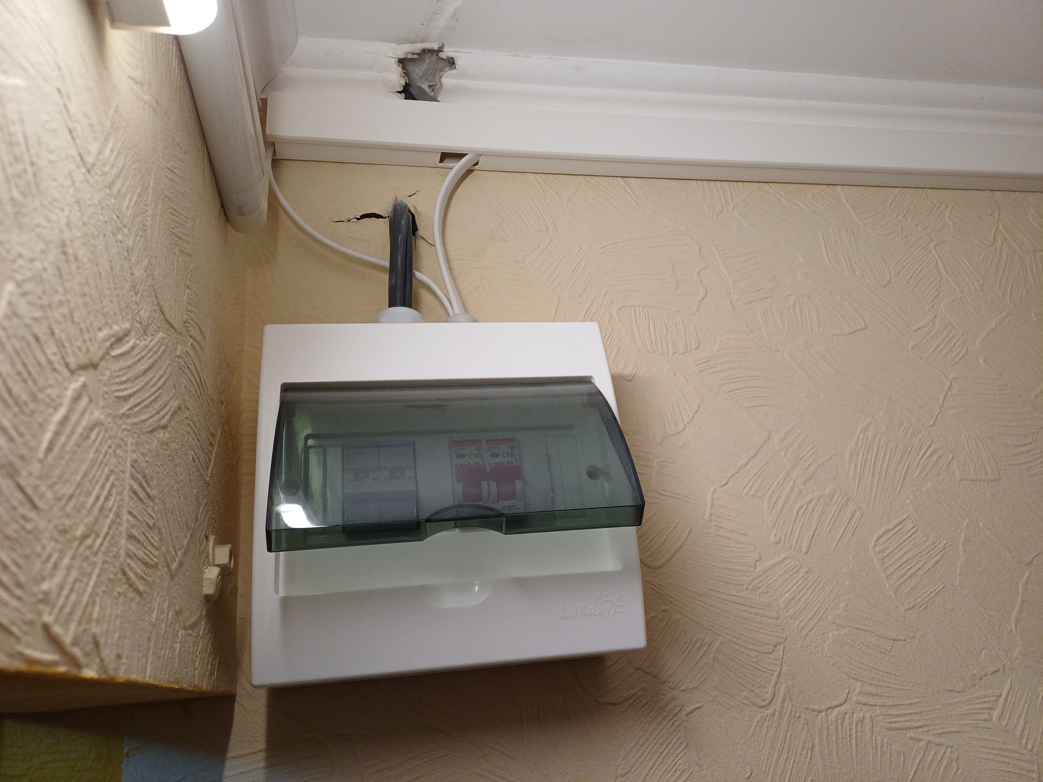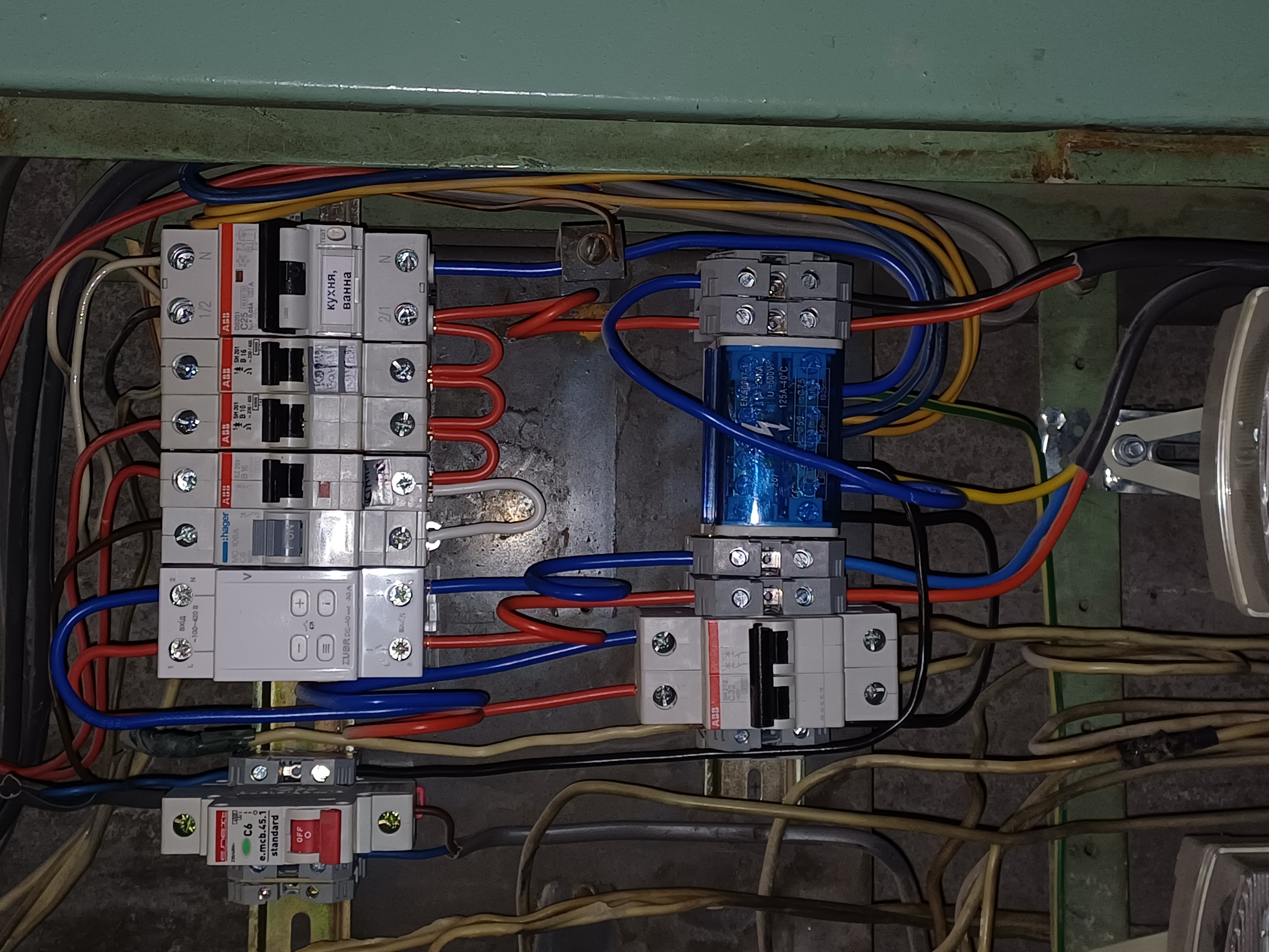 Коридорний щиток (будинку 40 років): Знизу зліва, над лічильником - двополюсний ввідний вимикач, з нього йдуть дроти до реле напруги, потім - до клемника, з темним кабелем ВВГ 3х4 мм2 (чи аналог). Це кабель "в квартиру", до перемикача. Другий клемник справа знизу там же - це, відповідно, вихід кабелю від квартирного перемикача вводів. Після цього клемника - все йде на квартирні автомати, як раніше (раніше йшло одразу після реле напруги). (форум повернув фото на 90 градусів. Якщо його відкрити у новому вікні - то воно буде нормальне, вертикальне).