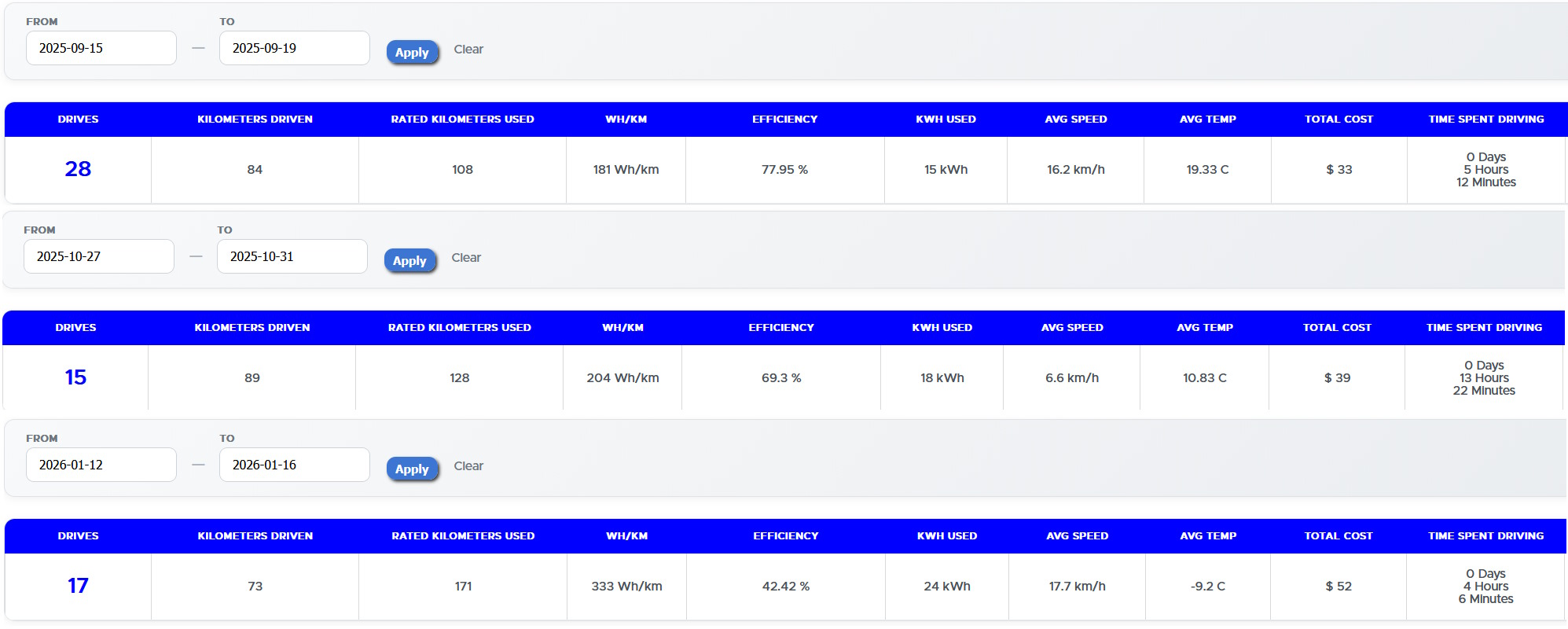 Проте, якщо брати більш довгі поїздки, типу як катнути на столічку, наприклад, то вчора при -12 це було 21кВт/100, а в березні 25го при 0 - 17 кВт/100