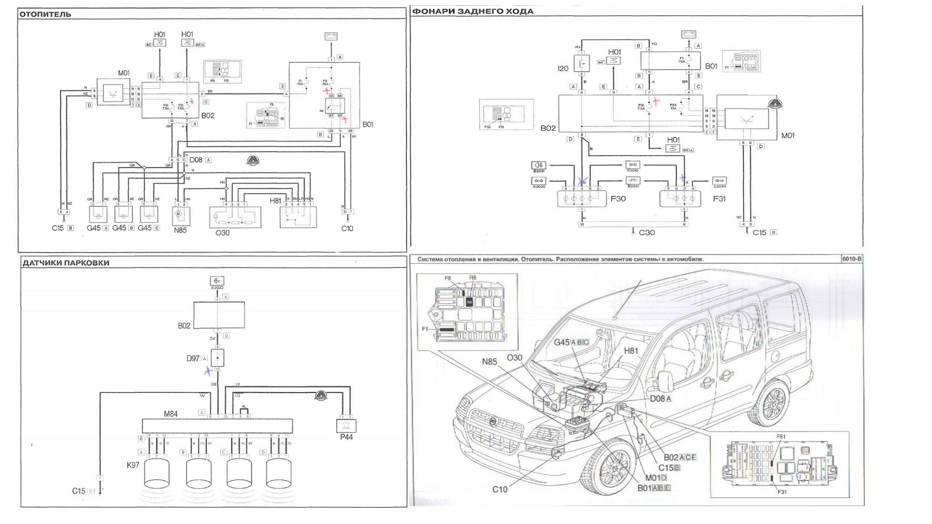 Fiat? Конкретно Добло 1,6 2004/5 рік. Е проблема, Рано чи пізно вирішу сам, але готовий у РОЗУМНИХ сумах заплатити за вирішення бо платити по 1000 грн година за пошук я як би не гтоовий... При встановленні камери ЗХ був коротиш. Прєд 31 що згорів був поміняний АЛЕ ані світло ЗХ ані парктронік ані вентилятор пічки на УСІХ оборотах так не запрацював. На ВХІД запобіжників 51,31 та 8 +12 приходить, реле спрацьовує але далі - ні..я. Пересмикував роз'єм Д - вентилятр запрацюввав пару секунд.. після того - дзуськи. Якщо дати +12 на лампу у фонар зх то працює обидва та парктронік тобто коротиша вже нема. Мабутьтреба дивитись до блока запобіжників. ХТО є без корони з гайкою під головою щоб подивися? Рано чи пізно знайду й сам але... поки що зайві 24 години на добу щось знайти не вижодить