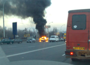 На фото видно рядом проезжающие машины - интересно не боятся что порыв ветра и... гореть будет 2-3 машины? Безпечный наш народ. А машину спасать бесполезно.