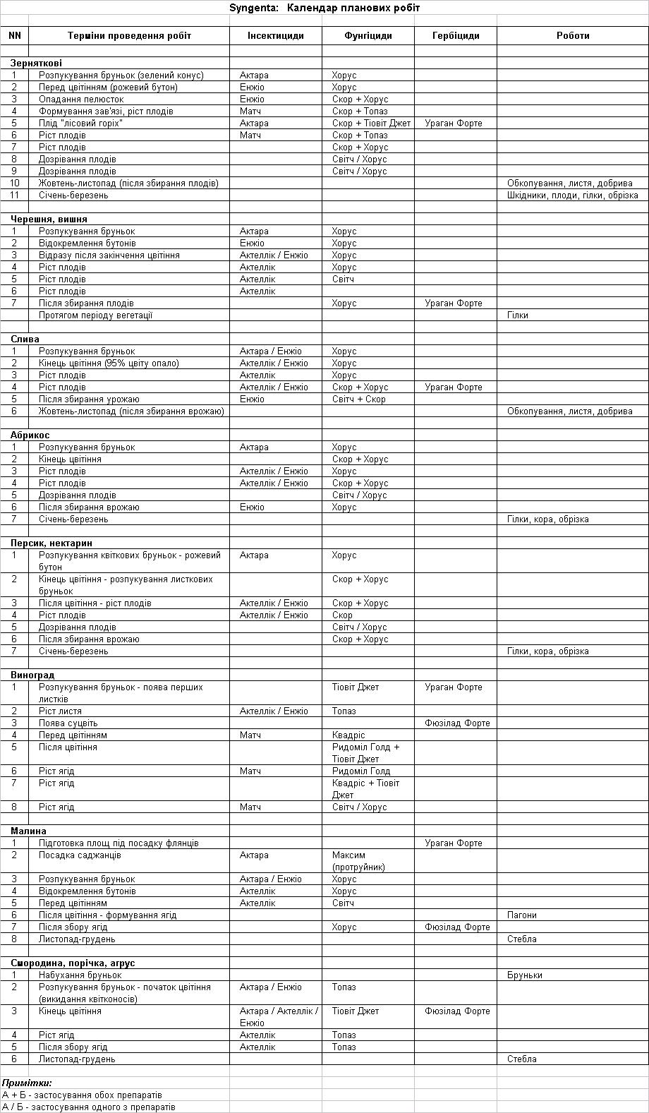 Раз на пару років пишу з приводу обробок саду і графіку і переліку препаратів на цьому форумі лише одну пораду: зайдіть на сайт Сингента Україна (Syngenta) знайдіть внизу або збоку сторінки розділ «Каталоги», а у ньому «Довідник для присадибних ділянок 2018». Там усе: календар обробок, перелік препаратів, болячки рослин і чим їх лікувати з картинками. Таких Довідників у Сингенти було декілька, найзмістовніший був 2014 року (здається), потім вони стали менш докладними, але все одно - це єдиний системний матеріал, який я знайшов у Інтернеті (Басф і Баєр такого не пишуть, або я не знайшов). Крім цього - хімікати Сингенти продаються на кожному кутку і не є проблема купити аж 3-4 назви на весь сезон для саду.