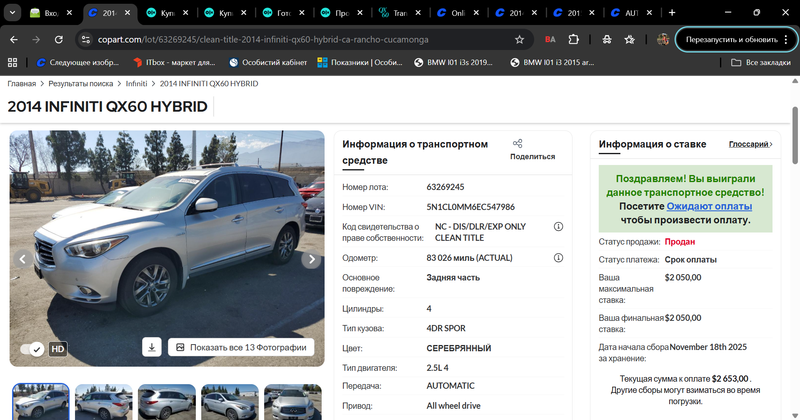 Отыграла клиентке INFINITI QX60 HYBRID 2014 год, пробег 83 тысячи, лот отыгран за 2050 долларов, растаможенная в Киеве на транзитных номерах и с договором купли продажи 9917 долларов.