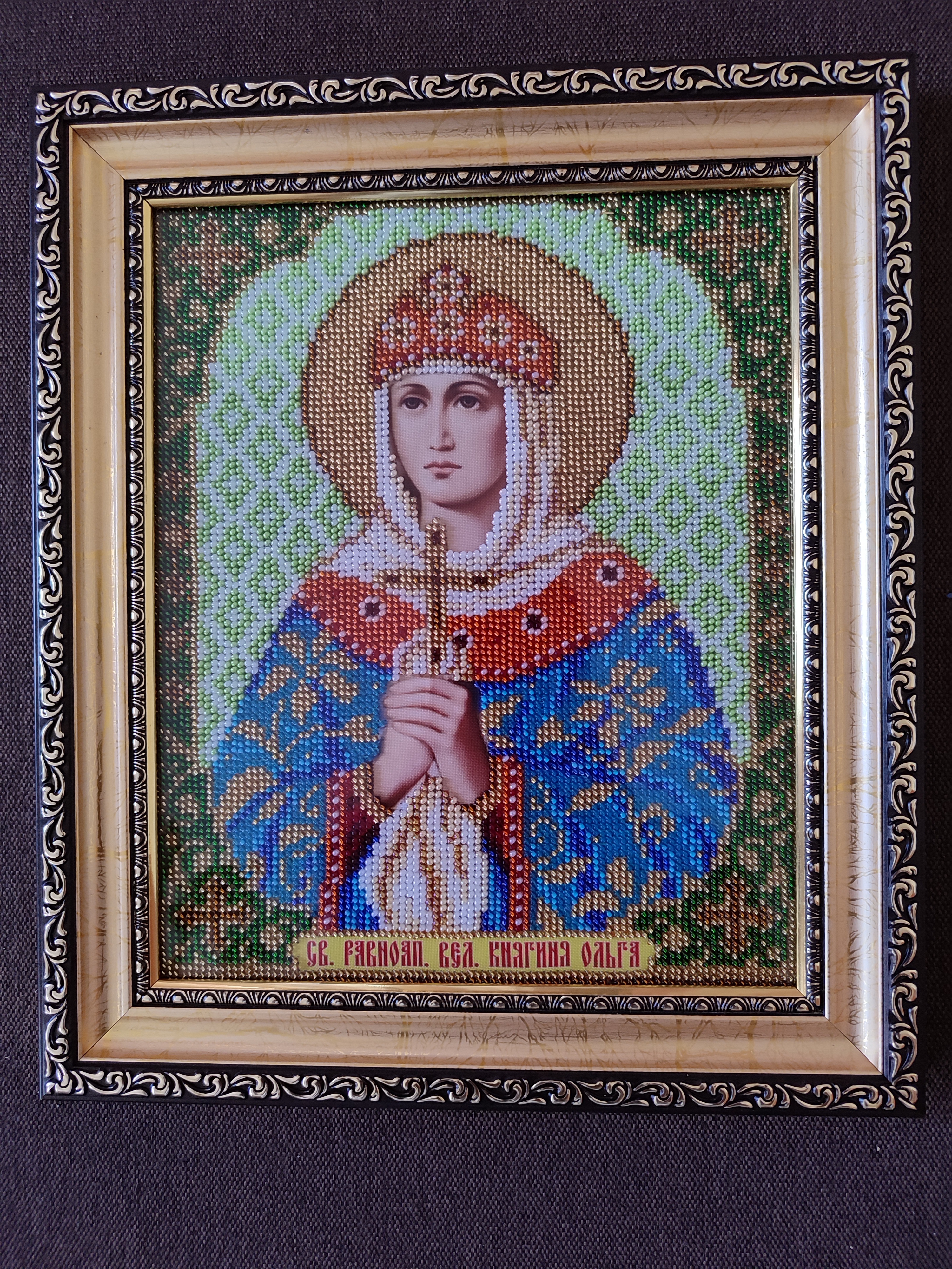 Появилась возможность продажи одной из своих работ, вышитых бисером собственноручно - Именной иконы Святая Ольга Икона полностью готова и оформлена в красивую рамку в багетной мастерской. Параметры: Высота (с рамкой) -31 см; Ширина (с рамкой) - 26,5 см. Ширина самой рамки - 4,5 см. Хорошее решение для человека, носящего это прекрасное имя (как для себя, так и-в качестве подарка). По цене - 1500 грн. Немного фото ниже:
