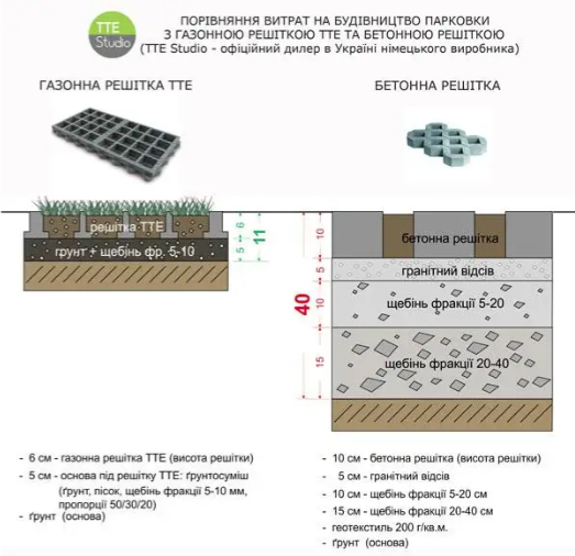 Вивчав свого часу це питання і зупинився на варіанті екопарковки ТТЕ - армований композит. Не найдешевший варіант, але виявився доволі практичним. Основа - трамбований щебінь, потім трамбований пісок. Дуже легко вкладається. Три роки експлуатації без проблем поки.